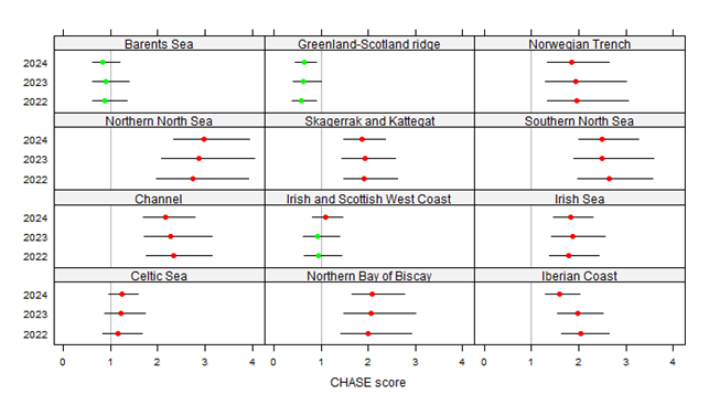 Figure 2: Sediment CHASE scores with 95% confidence intervals for 2022–2024