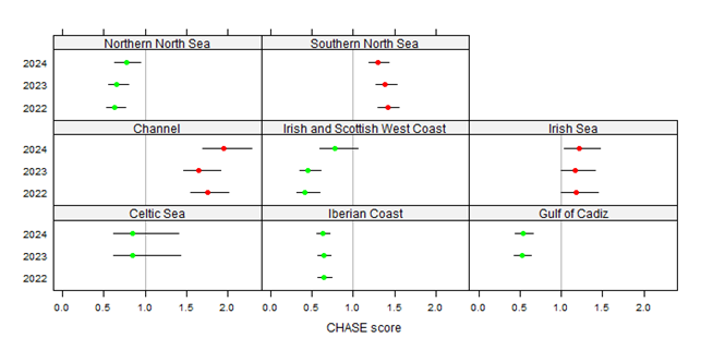 The biota and sediment CHASE scores are shown in Figure 1 and Figure 2 respectively. The scores for 2022 and 2023 are also shown for comparison. There is little change for biota. For sediment, the CHASE score for the Irish and Scottish West Coast has increased (due to the change in analytical laboratory) although remains below 1.