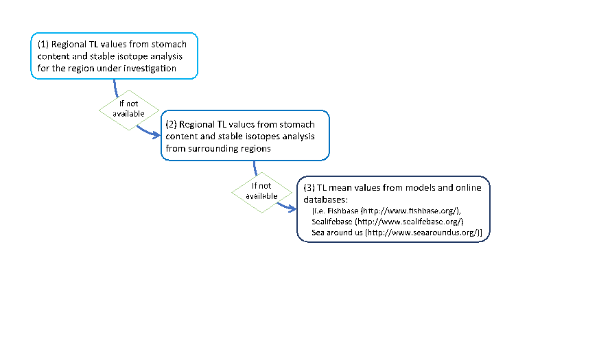 Some preliminary work is needed to collate regional TL values per species. This improves the reliability of TL values for the Bay of Biscay because the diet of species (and hence the predator-prey relationships) may vary among regions. Three sources of TL information are prioritised to ensure the most appropriate TL value for each species (Figure b).