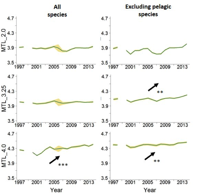 The MTL calculated using landings data and considering all trophic levels (MTL_2.0 in Figure d) displayed no significant trend over the study period, whether all species were considered or pelagic species were excluded. However, significant increases in the MTL indicator were detected when MTL cut-offs were applied. A significant positive trend in MTL_3.25 was observed when pelagic species were excluded. It underlined the effect that the variability in pelagic species biomass has in masking the evolution of the bentho-demersal biomass. MTL_4.0 (top predators only) increased significantly in both cases (with or without pelagic species).