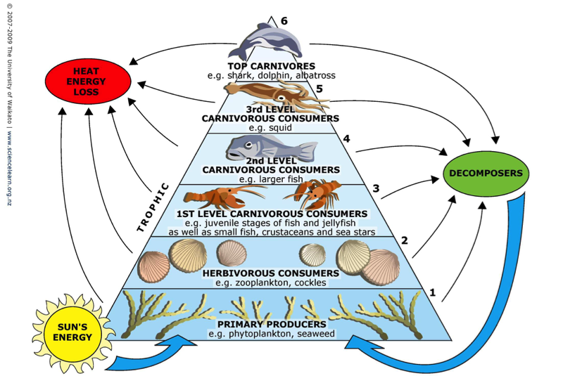 Figure a: Representation of the concept of Trophic Level in a food web. (adapted from 2007-2009 The University of Waikato)