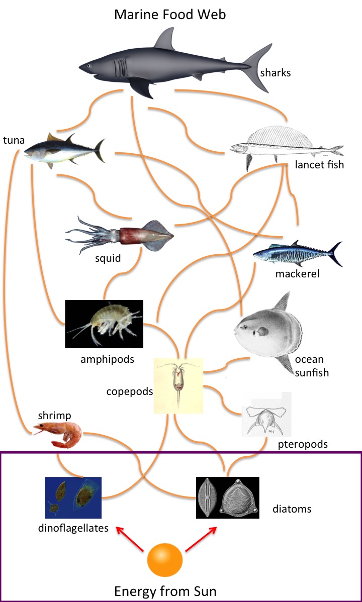 Figure 1: Representation of a marine food web (purple box represents phytoplankton primary production)