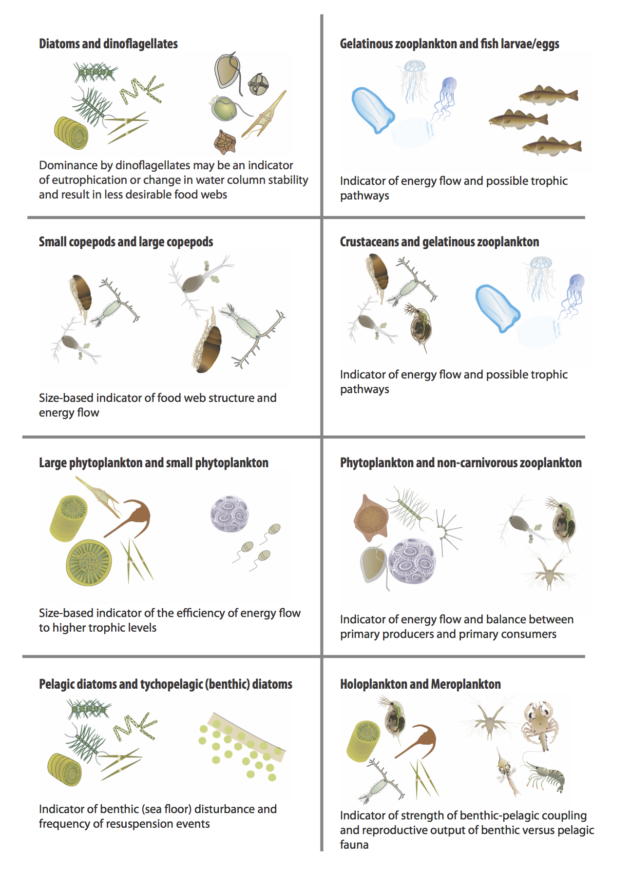 Plankton (microscopic algae and animals) form the base of the marine food web, making them important indicators for ecosystem state. Changes in plankton communities can affect higher food web levels, such as shellfish, fish and seabirds, since these organisms are supported either directly or indirectly by plankton. Indicators based on plankton lifeforms (i.e. organisms with the same functional traits; Figure 1) can be used to reveal plankton community responses to factors such as nutrient loading from human activities and climate-driven change. When examined in pairs with an ecologically-relevant relationship (Figure 1 for examples) changes in the relative abundance of two lifeforms together (called a lifeform pair) can indicate change in key aspects of ecosystem function, including links between pelagic and benthic communities, energy flows and pathways, and food web interactions.
