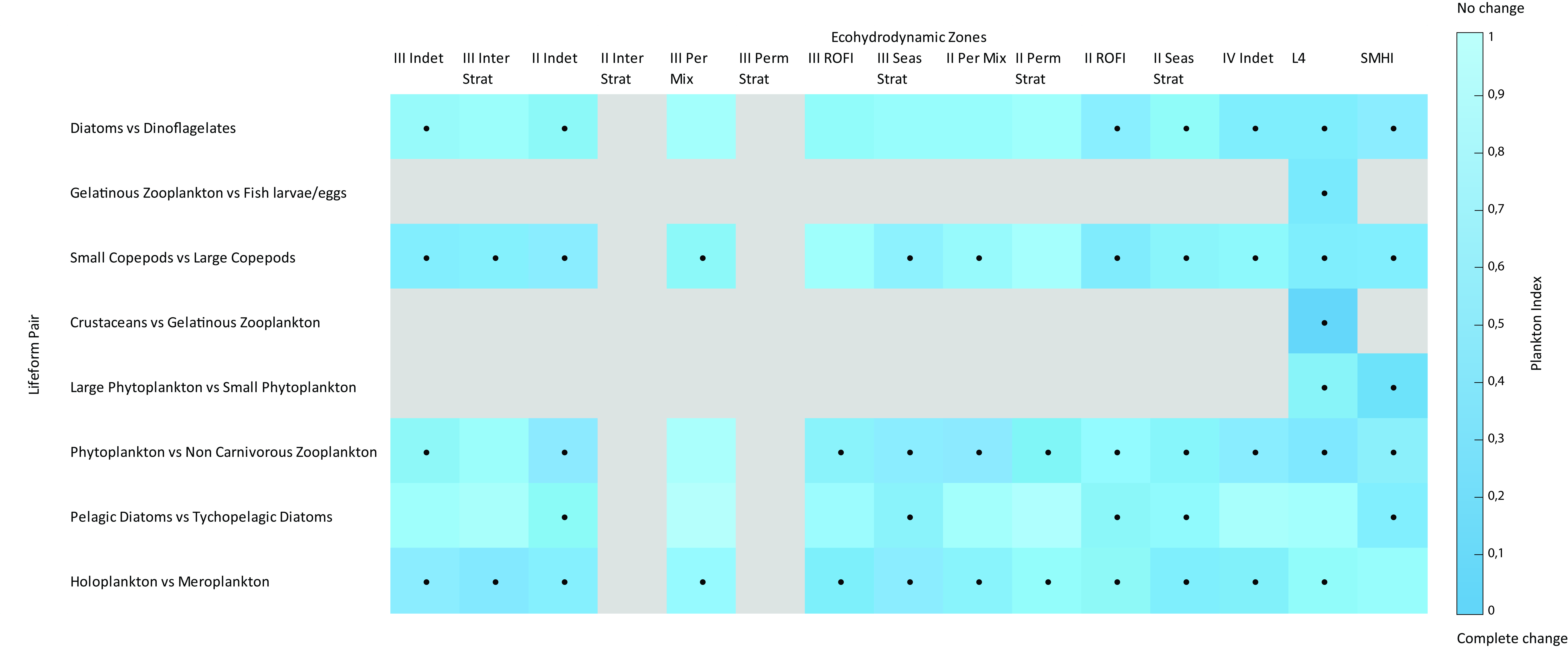Darker blue indicates a more pronounced change. Grey shading represents where there were not enough / well-represented data to determine a Plankton Index. Cells with dots indicate significant change (p<0.01) since the period 2004–2008. Changes in the Plankton Index do not necessarily indicate a deterioration of environmental conditions. They do, however, indicate change from starting conditions.The x-axis represents the ecohydrodynamic zones described in Figure 2.