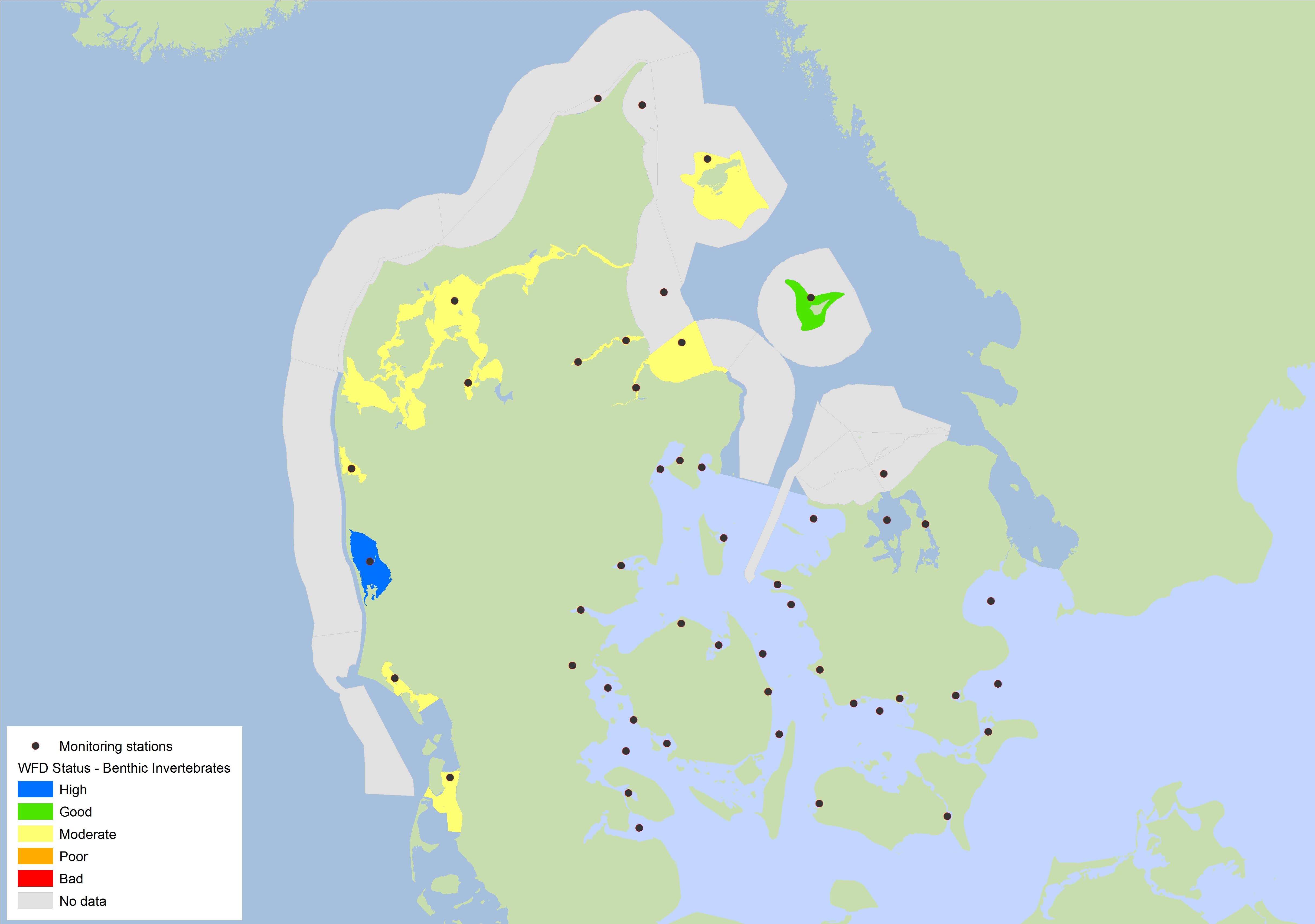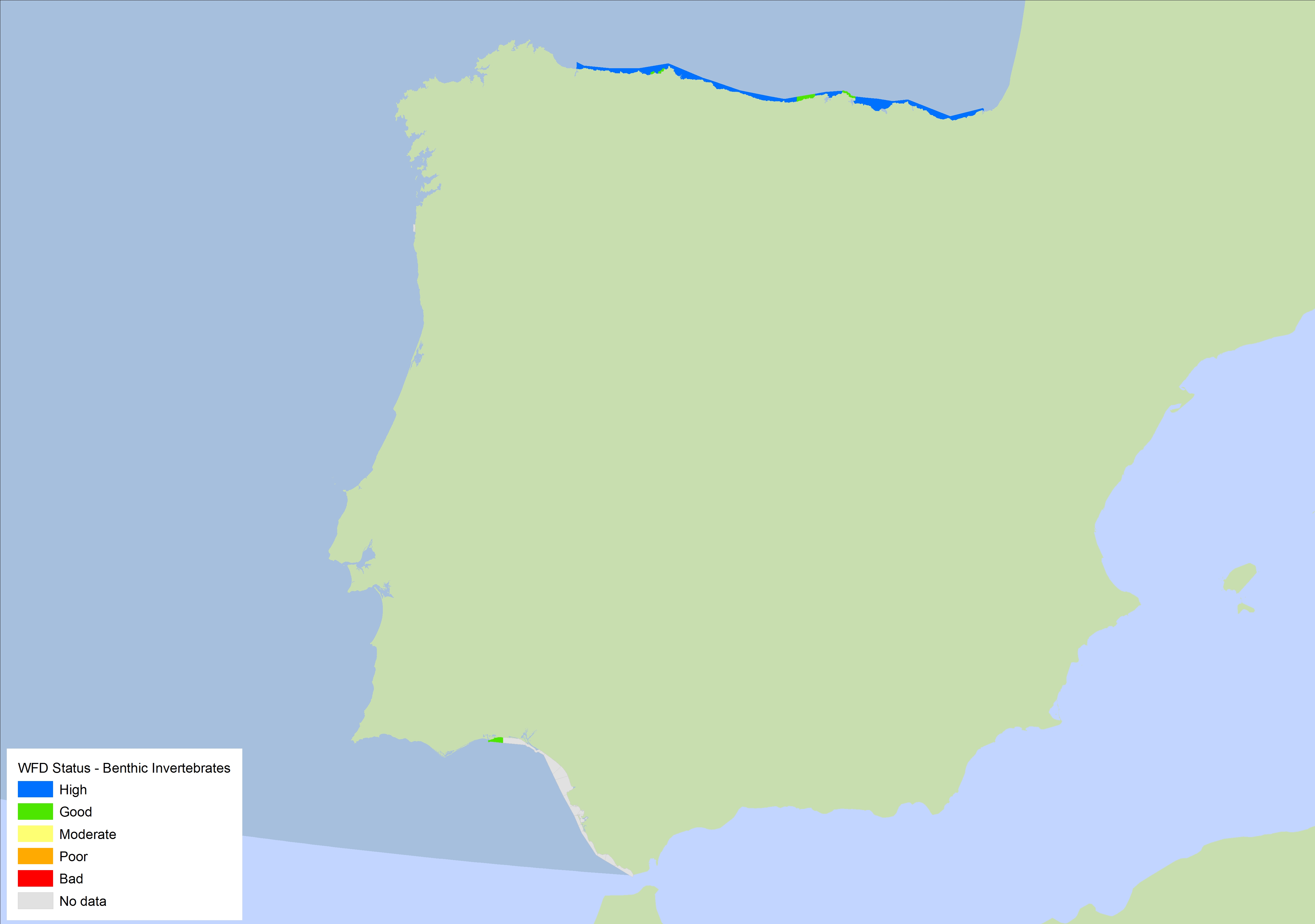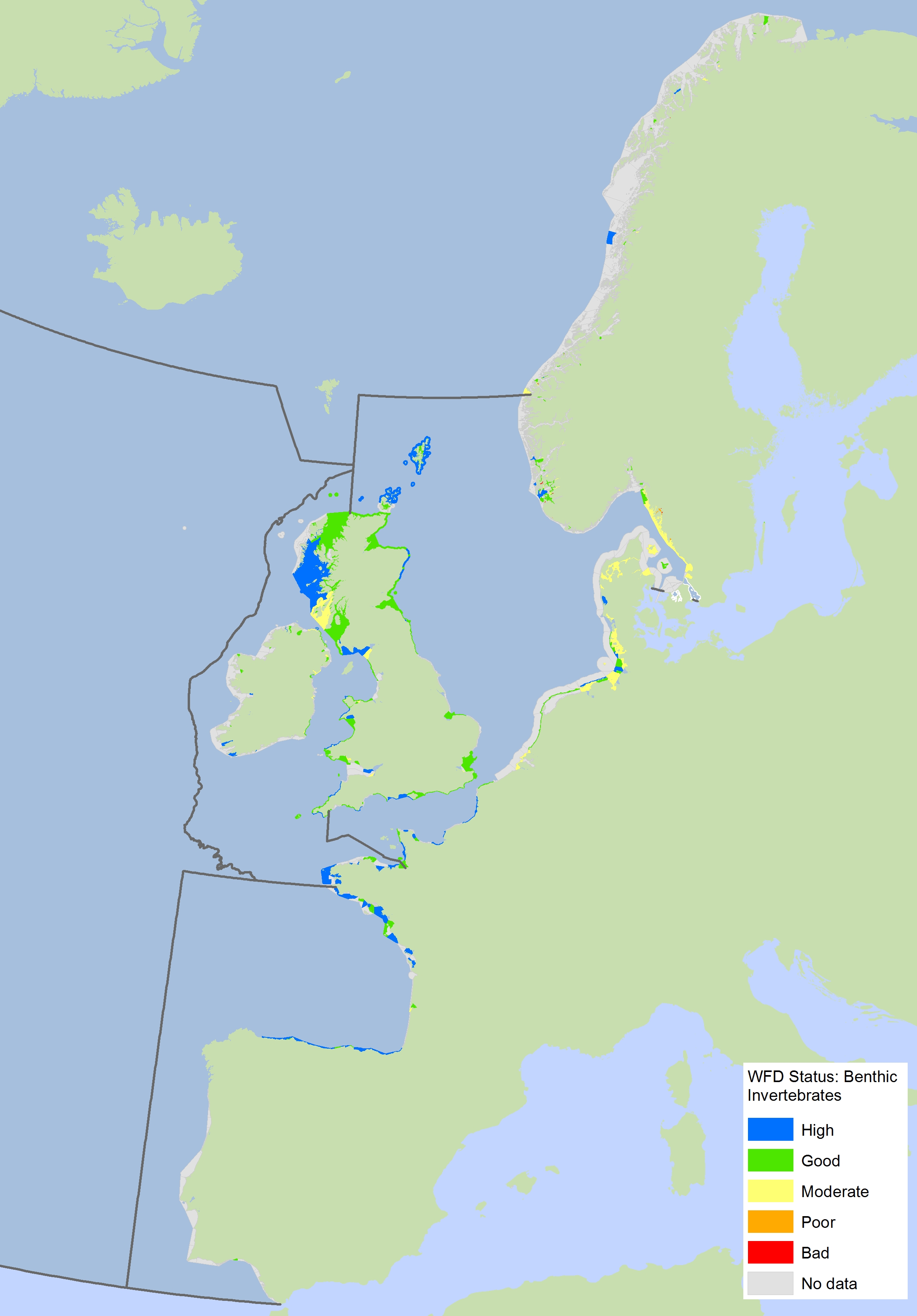 From a total of 2 934 WFD coastal water bodies in the Greater North Sea, Celtic Seas, Bay of Biscay and Iberian Coast, and Norwegian part of Arctic Waters, 777 (26.5%) have been classified for benthic invertebrates and 299 (10.2%) for macroalgae and angiosperms. Due to a mismatch between the identification of water bodies and assessment results, another 125 (4.3%) assessment results for invertebrates and 45 (1.5%) results for macroalgae and angiosperms could not be assigned to a water body and were not included in the assessment.