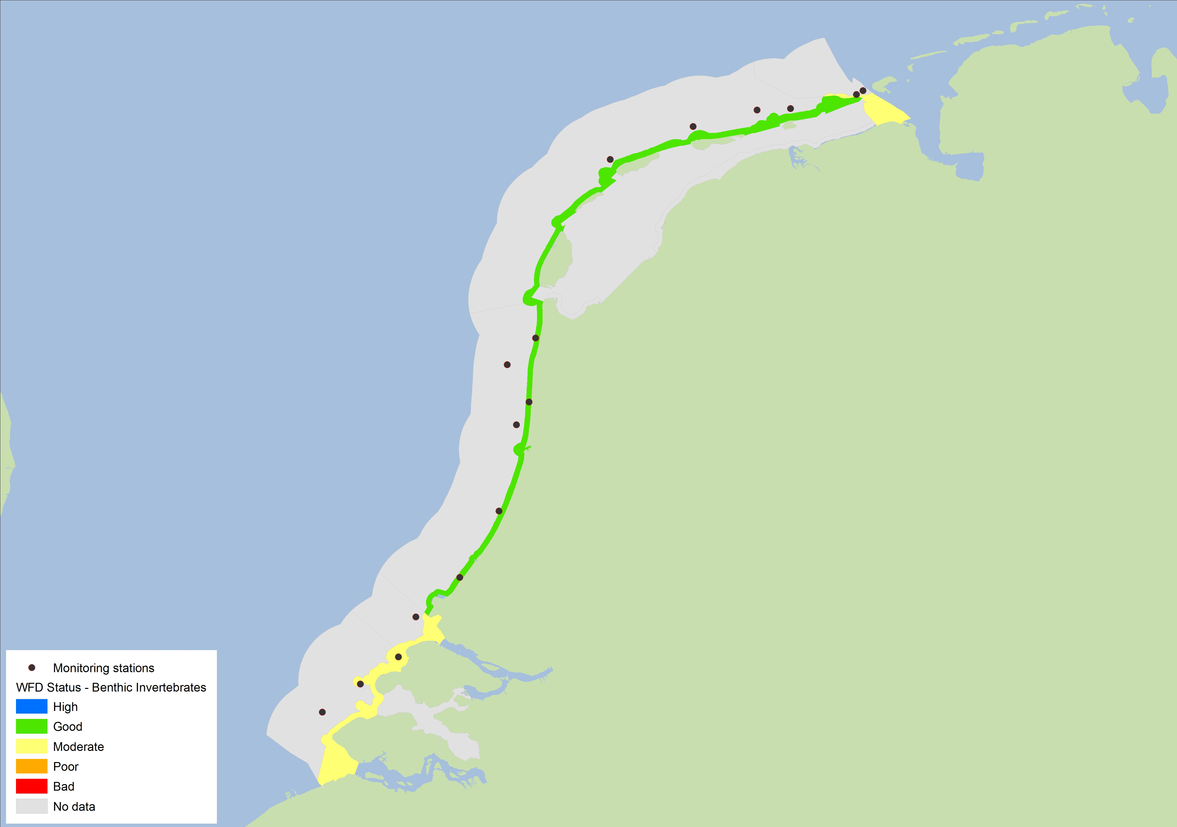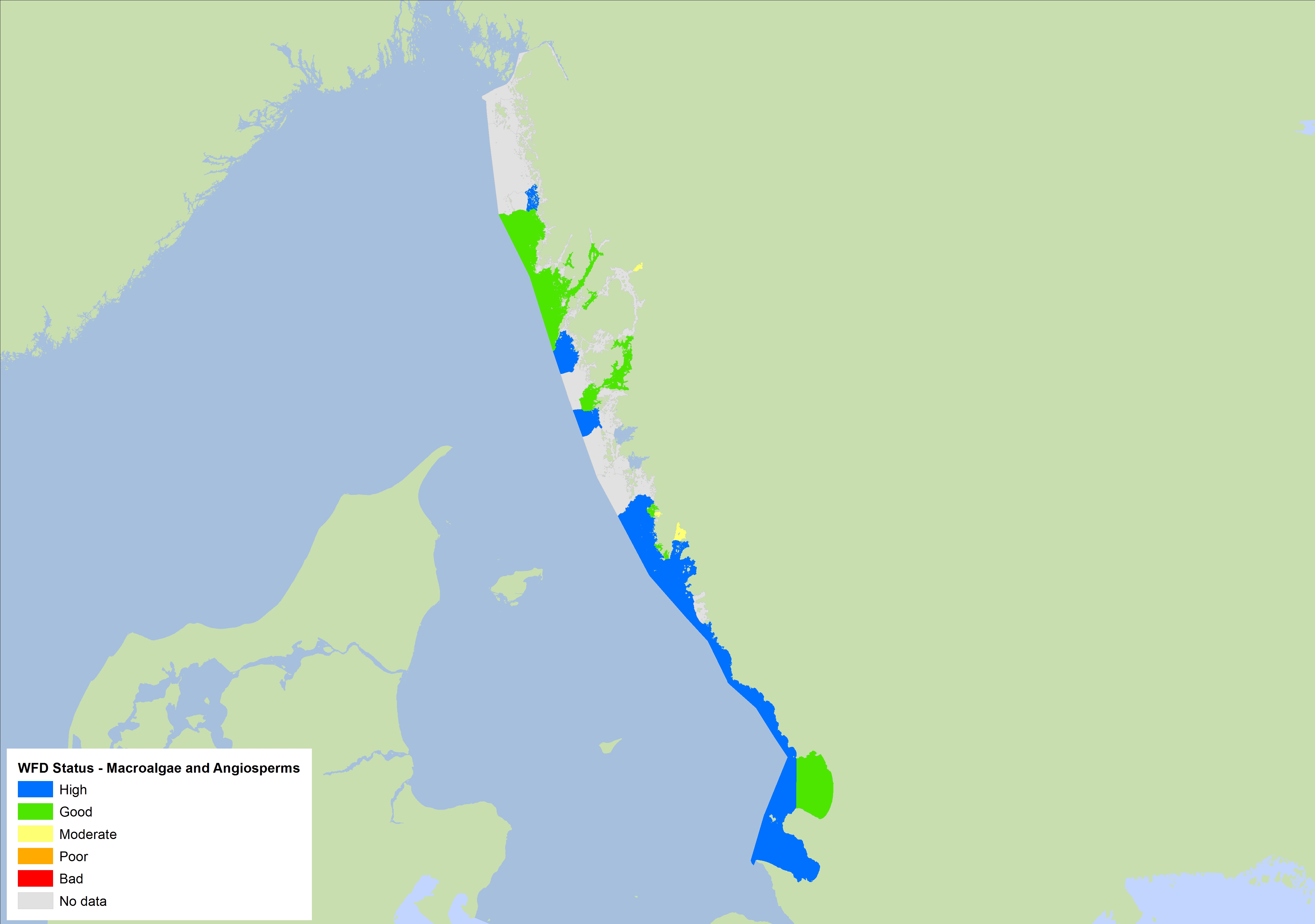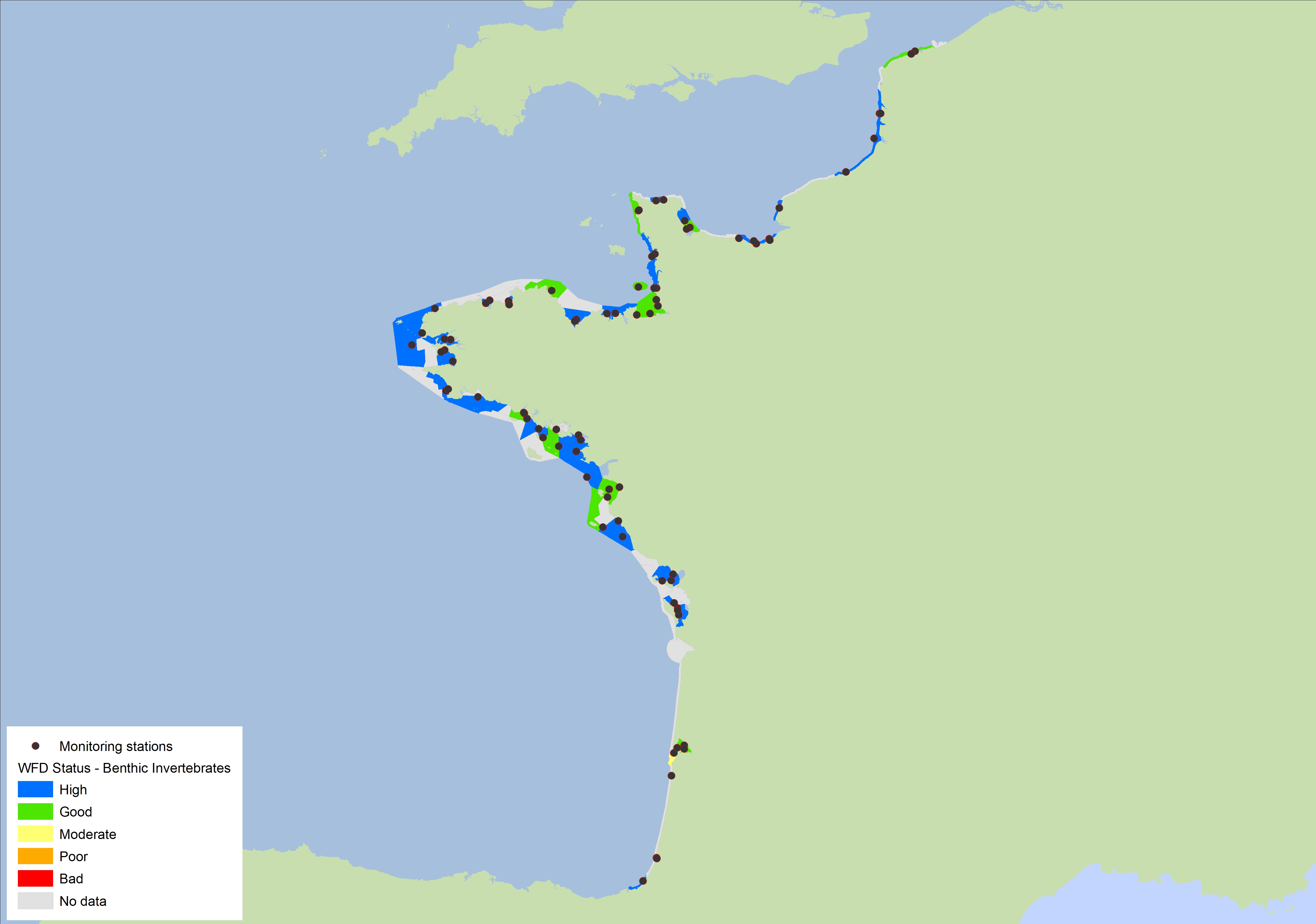 National assessment outcomes, according to available data at the time of writing, are presented in Figure a to Figure p, together with the location of monitoring stations. Data for benthic invertebrates (sediment) were provided from nine of the 11 OSPAR Contracting Parties with coastal water bodies in the North-East Atlantic. The assessment results for macroalgae and angiosperms were available from seven Contracting Parties. For the Netherlands and Belgium this quality element is not relevant due to prevailing conditions. France provided data for the sub-components (macroalgae and angiosperms) of the macrophytes assessment from different assessment periods, but no aggregated classification of the water bodies for this quality element was available. The majority of the status reports are from the second assessment cycle of the European Union Water Framework Directive (WFD) (2010–2015). Assessment results from Ireland and Wales date from the first cycle (2009). Norway, a non-European Union Member State, has implemented a monitoring and assessment programme of coastal water bodies, which enables them to contribute to this assessment of condition of coastal benthic habitat communities.