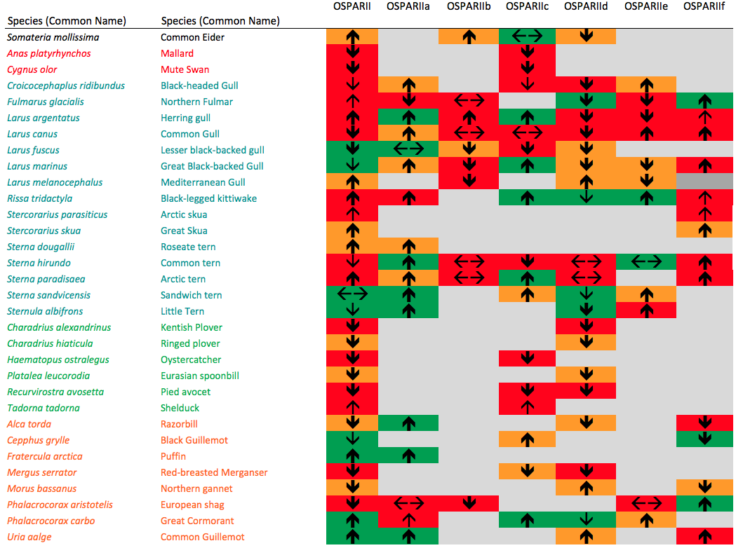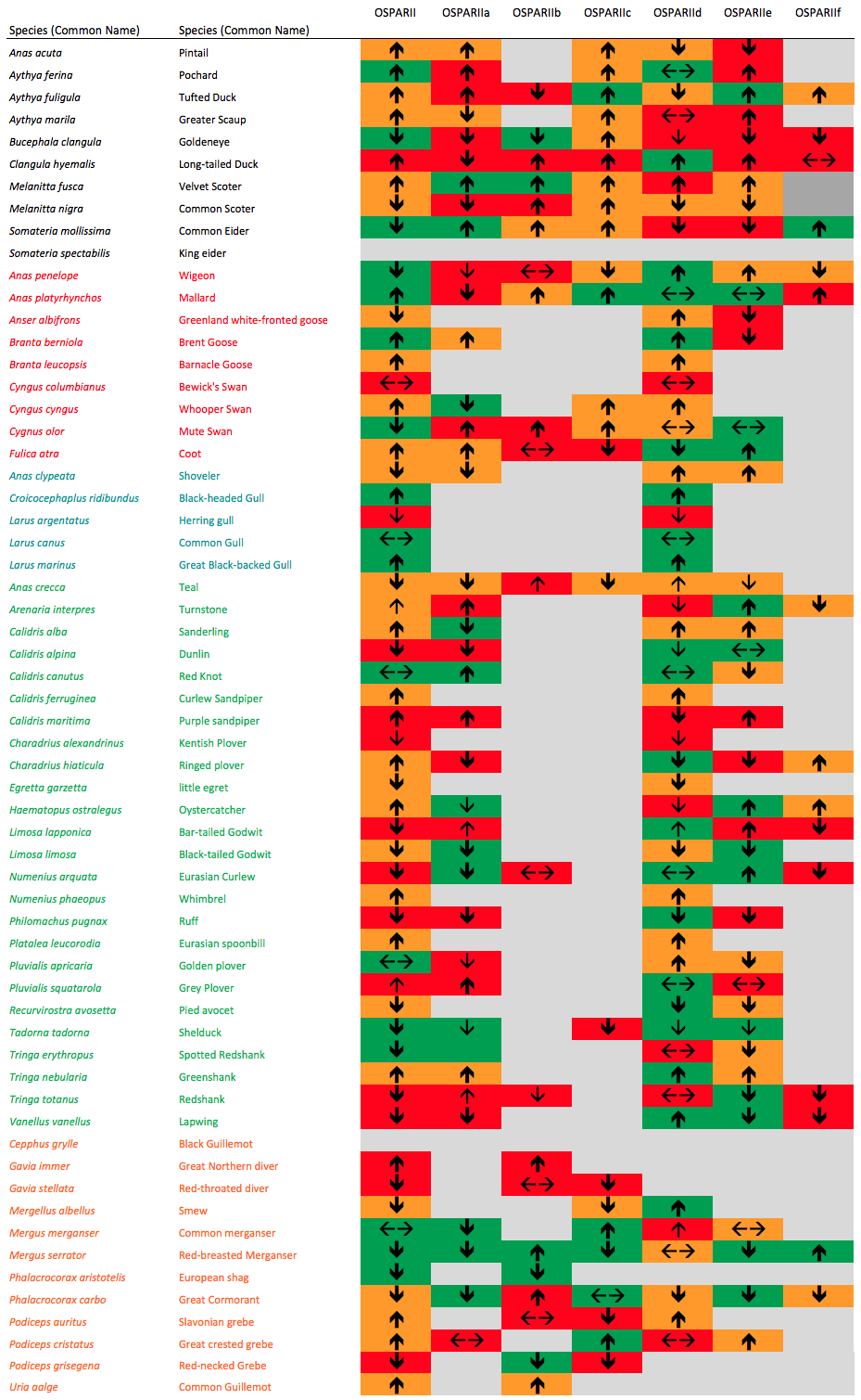 To provide greater insight into the likely impacts operating on relative breeding abundance and on relative non-breeding abundance, species-specific assessments were integrated at different spatial scales: for each OSPAR Region and for each sub-division of the Greater North Sea and Arctic Waters. Within each Region, species-specific assessments were also integrated for each functional group (Table a).