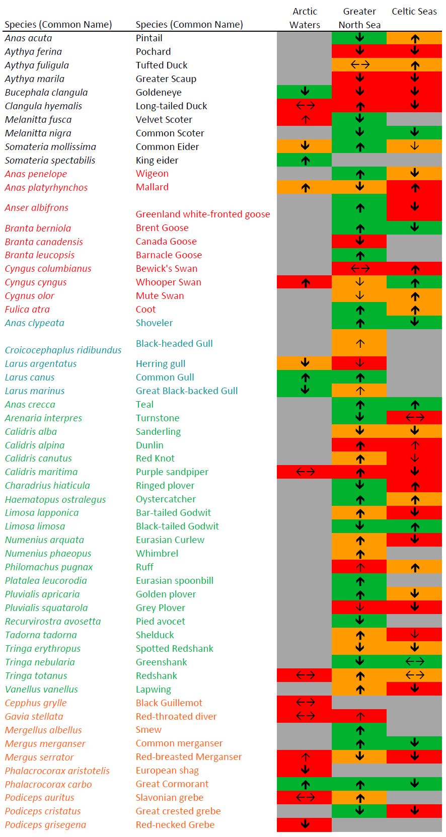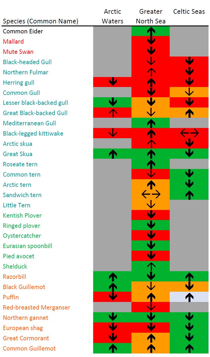 The individual species that have failed to meet assessment values are shown in red in Figure b (breeding abundance) and Figure c (non-breeding abundance). There were few species for which breeding and non-breeding abundance could both be assessed: five in the Arctic Waters, 14 in the Greater North Sea and only one in the Celtic Seas. (see Figures b and Figure c).