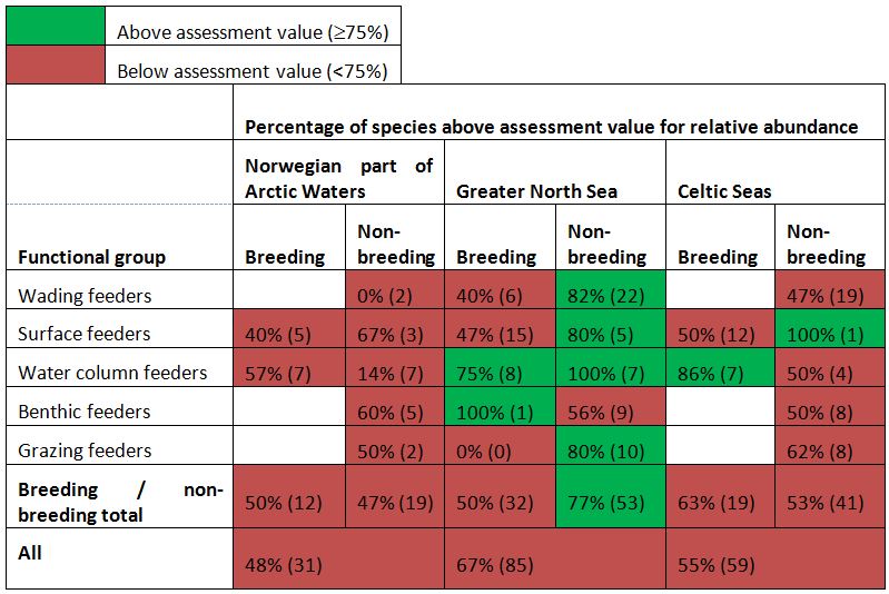 The percentage of all species within each functional group exceeding assessment values for relative breeding abundance and for relative non-breeding abundance in 2014 in the Greater North Seas and in 2015 in the other OSPAR Regions are shown in Table 1.