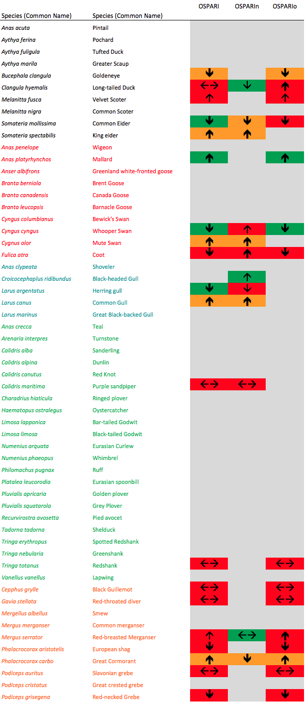 The assessment values used in this indicator assessment were developed for breeding seabirds’ abundance data in order to assess the OSPAR Ecological Quality Objective (EcoQO) on seabird population trends as an index of seabird community health (ICES, 2008, 2010, 2011, 2012). This indictor supersedes the EcoQO as it incorporates data on more species, including waterbirds and also uses data on non-breeding abundance. This indicator has gone through extensive testing and development (see ICES, 2013a,b,c,d, 2015). OSPAR IA2017 indicator assessment values are not to be considered as equivalent to proposed European Union Marine Strategy Framework Directive (MSFD) criteria threshold values, however they can be used for the purposes of their MSFD obligations by those Contracting Parties that wish to do so.