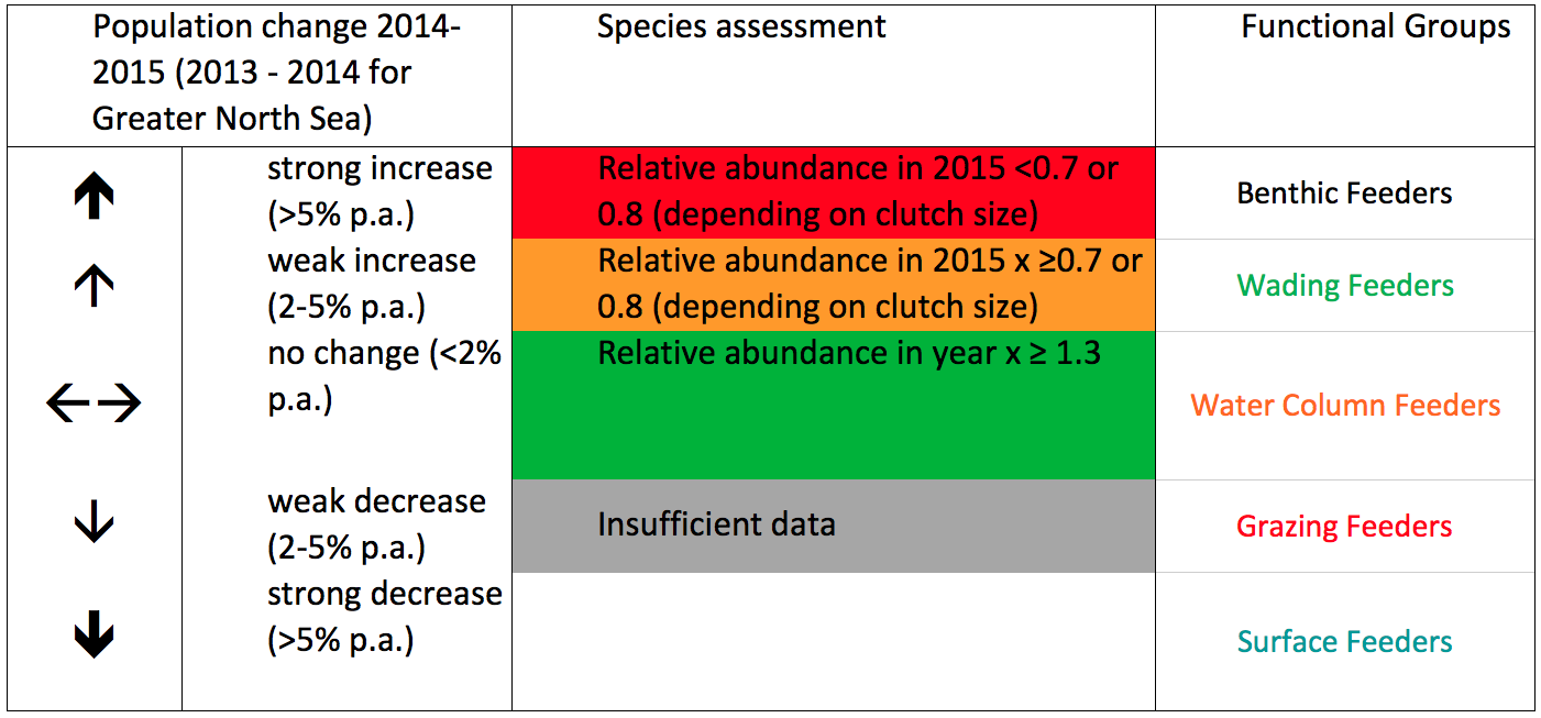 The reason for having two assessment values is because species that lay only one egg are expected to recover more slowly from declines in population size than species that can potentially produce more than one chick per year. If relative abundance is below the appropriate assessment value, it is considered to be in ‘poor’ status and further research and / or management is recommended, depending on what is appropriate.