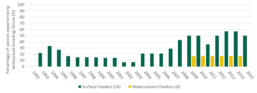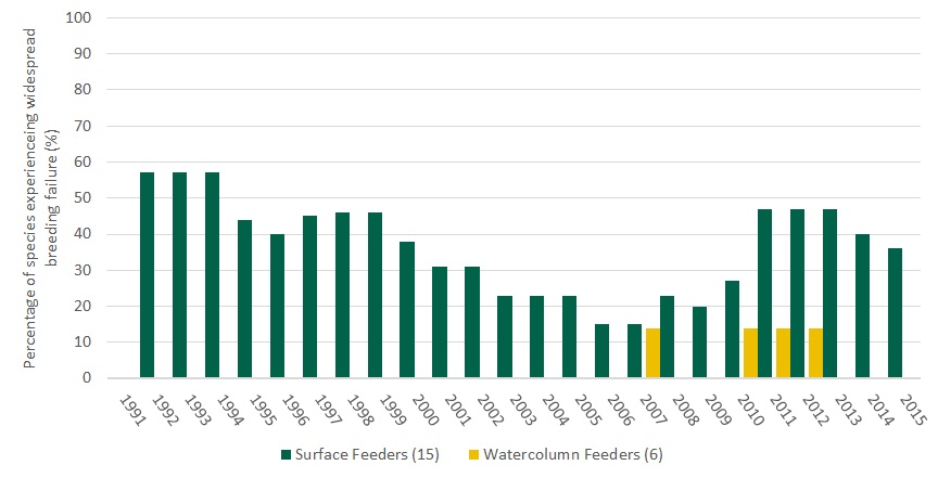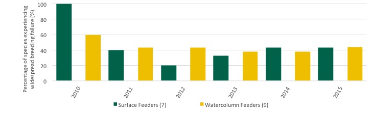 In the Norwegian parts of the Arctic Waters, an equal proportion of surface feeders and water column feeders exhibited widespread breeding failure. This suggests the availability of prey fish may be low throughout the water column in some areas (from the surface to the seabed), for example sandeel and young herring. Prey availability is likely to be driven by ecosystem specific changes, possibly initiated by commercial fisheries (past and present) in combination with climate change.