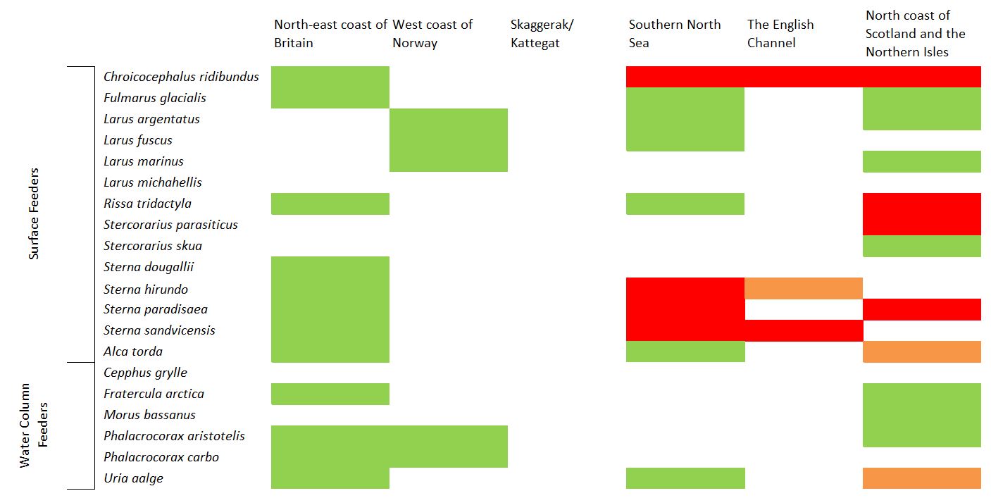 Species ordered by functional group. Colour of cells indicates the number of years during the six year assessment period (2010 to 2015) that annual colony failure rate was widespread (i.e. exceeded species-specific assessment values ): green = two years or less; orange cells = three years; red = four years or more. Greater North Sea sub-divisions are a) North-east coast of Britain; b) west coast of Norway; c) Skagerrak/Kattegat; d) Southern North Sea; e) The English Channel; f) North coast of Scotland and the Northern Isles.