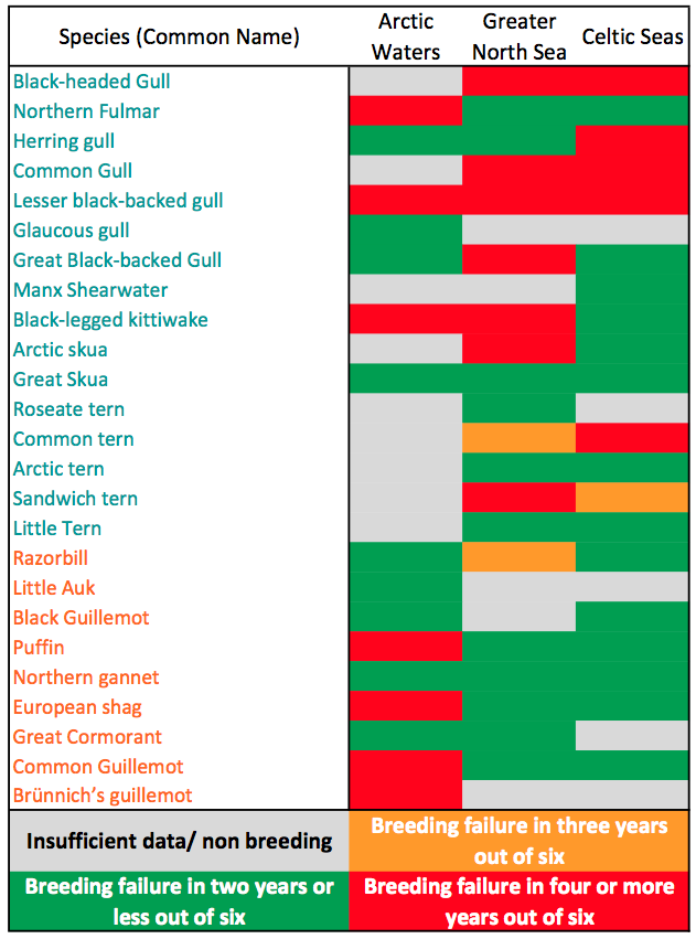 | Resource abstract | Common indicator assessment of B3-Marine bird breeding success/failure. Applicable to OSPAR Regions I (Arctic Waters) II (Greater North Sea), III (Celtic Seas). Over the last decade, widespread breeding failure has occurred frequently in a growing number of seabird species across the Greater North Sea, Celtic Seas and Norwegian parts of Arctic Waters. In the Greater North Sea and Celtic Seas, species that frequently failed to raise young all feed on small fish at the surface. |