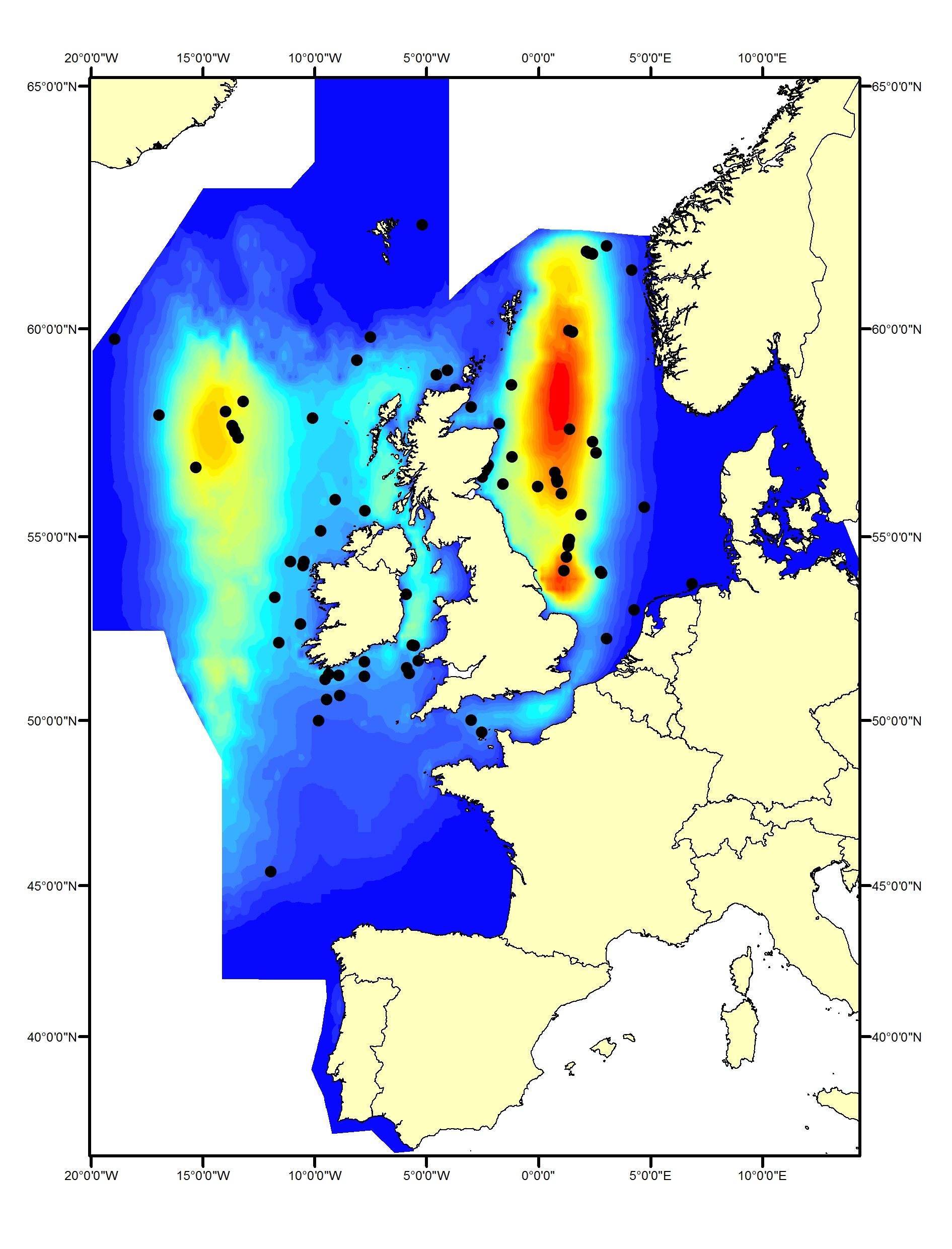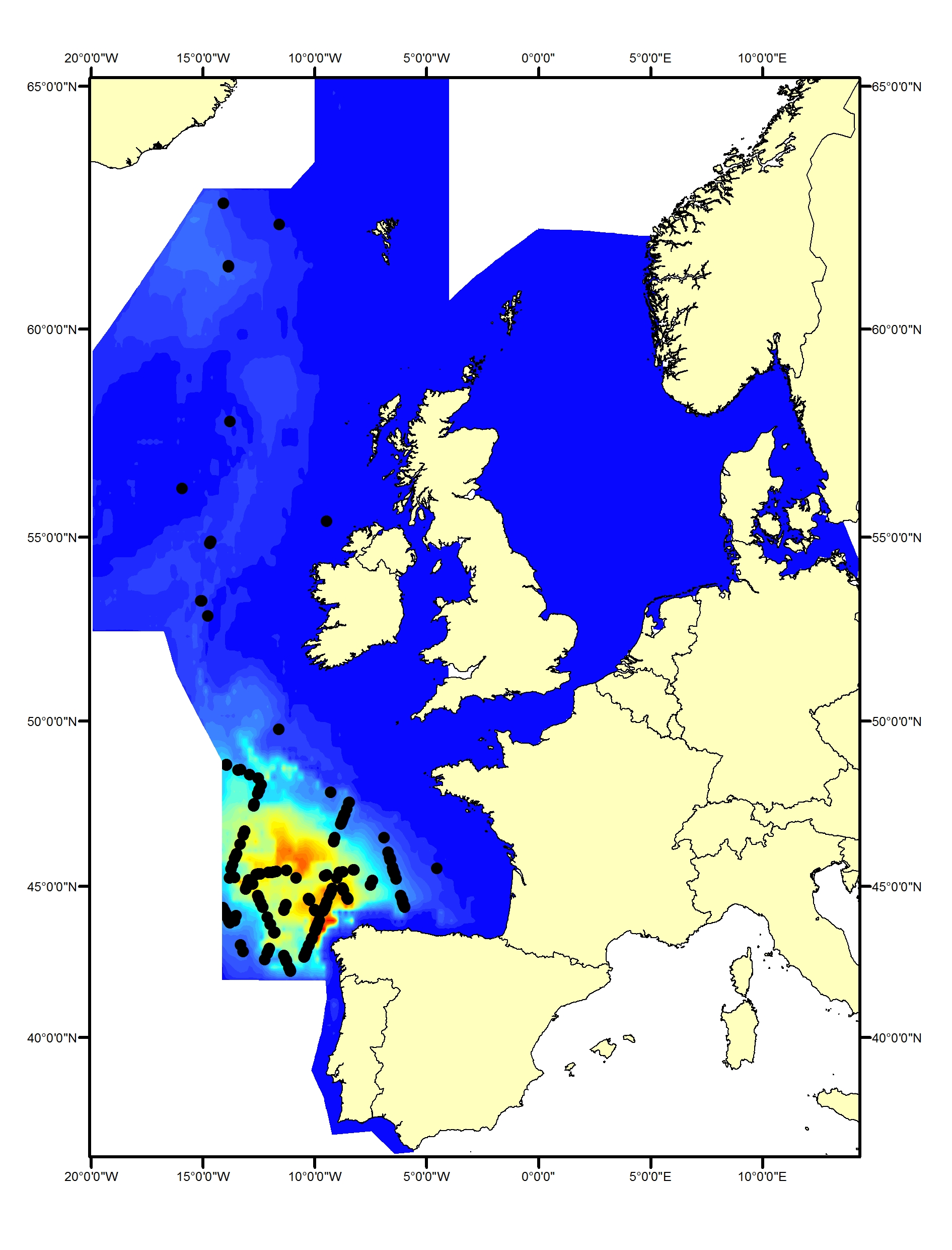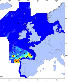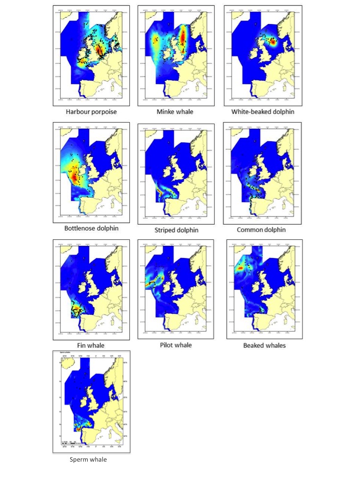 Cetaceans make up an important component of marine biodiversity in the North-East Atlantic Ocean, as is clearly shown by their distribution and density. Data from the systematic large-scale surveys in 2005 (Small Cetaceans in the European Atlantic and North Sea; SCANS II) and 2007 (Cetacean Offshore Distribution and Abundance in the European Atlantic; CODA) and the Trans North Atlantic Sightings Survey (T-NASS) have been analysed using models that relate the density of species to features of their habitat to produce maps of predicted density distribution in the North-East Atlantic Ocean (Figure 1). These plots indicate that cetaceans are distributed widely across this area and the relatively small amount of overlap in predicted high-use areas highlights how the different species utilise the marine area in different ways, at least in summer. These and other similar data have been analysed to provide abundance estimates.