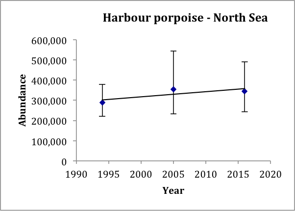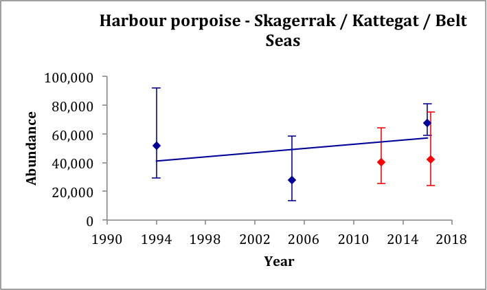 Three or more comparable estimates of abundance are only available for harbour porpoise, white-beaked dolphin and minke whale in the North Sea, and harbour porpoise in the Skagerrak / Kattegat / Belt Seas.
