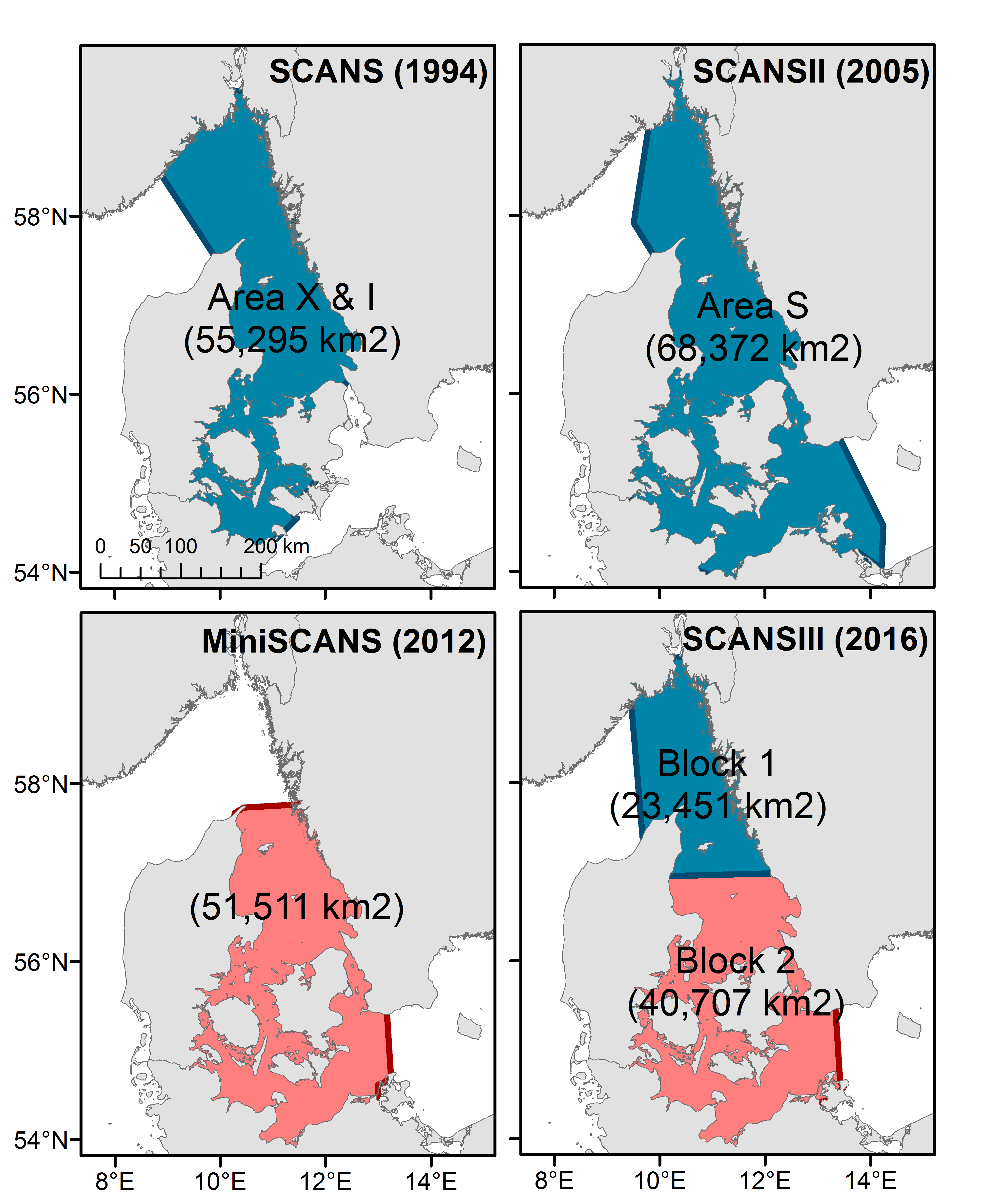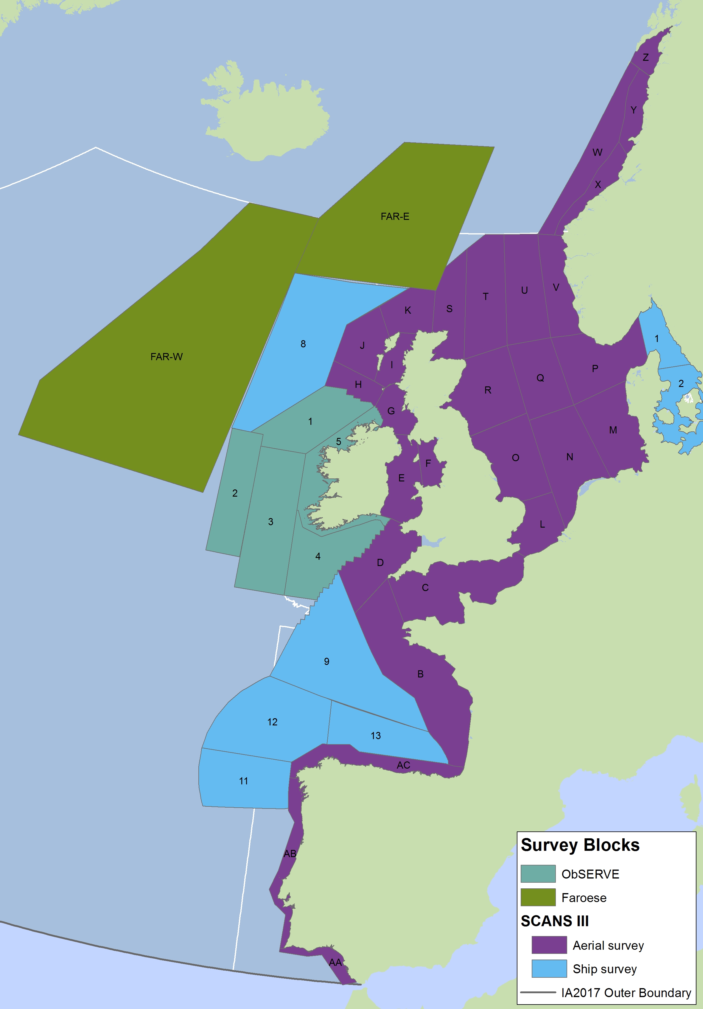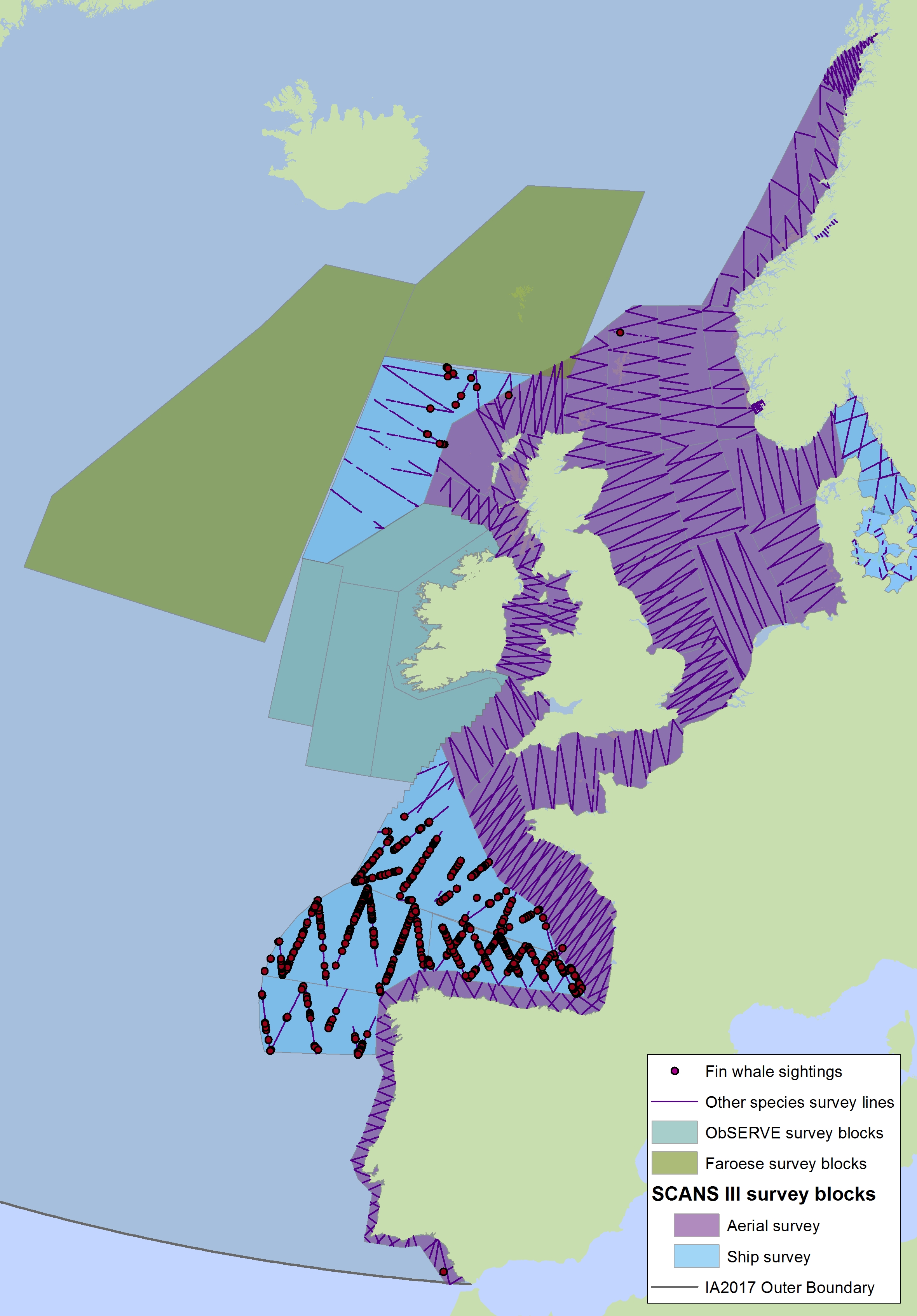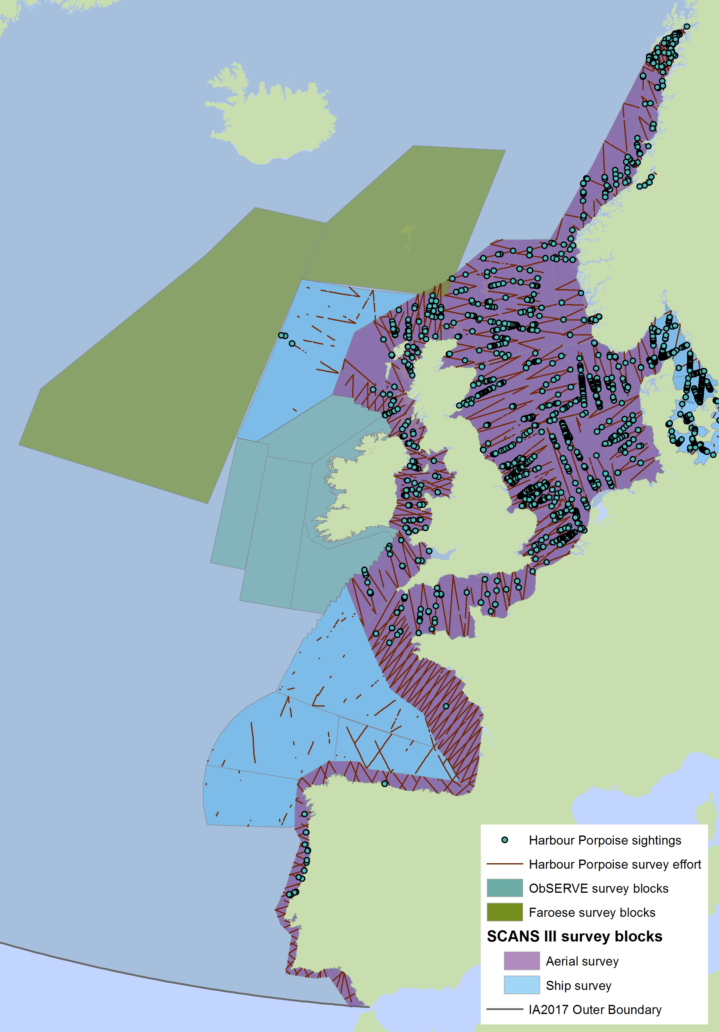 SCANS-III surveyed the entire European continental shelf by aerial survey, except for the Kattegat and Belt Seas area, which were surveyed by ship. Most of these waters were surveyed by ship In SCANS and SCANS-II. Methodologies employed for ship (two-team ‘tracker’) and aerial survey (circle-back) should generate unbiased estimates of abundance for most species (harbour porpoise, dolphin species and minke whale) so estimates for these species from ship and aerial surveys are, therefore, comparable.