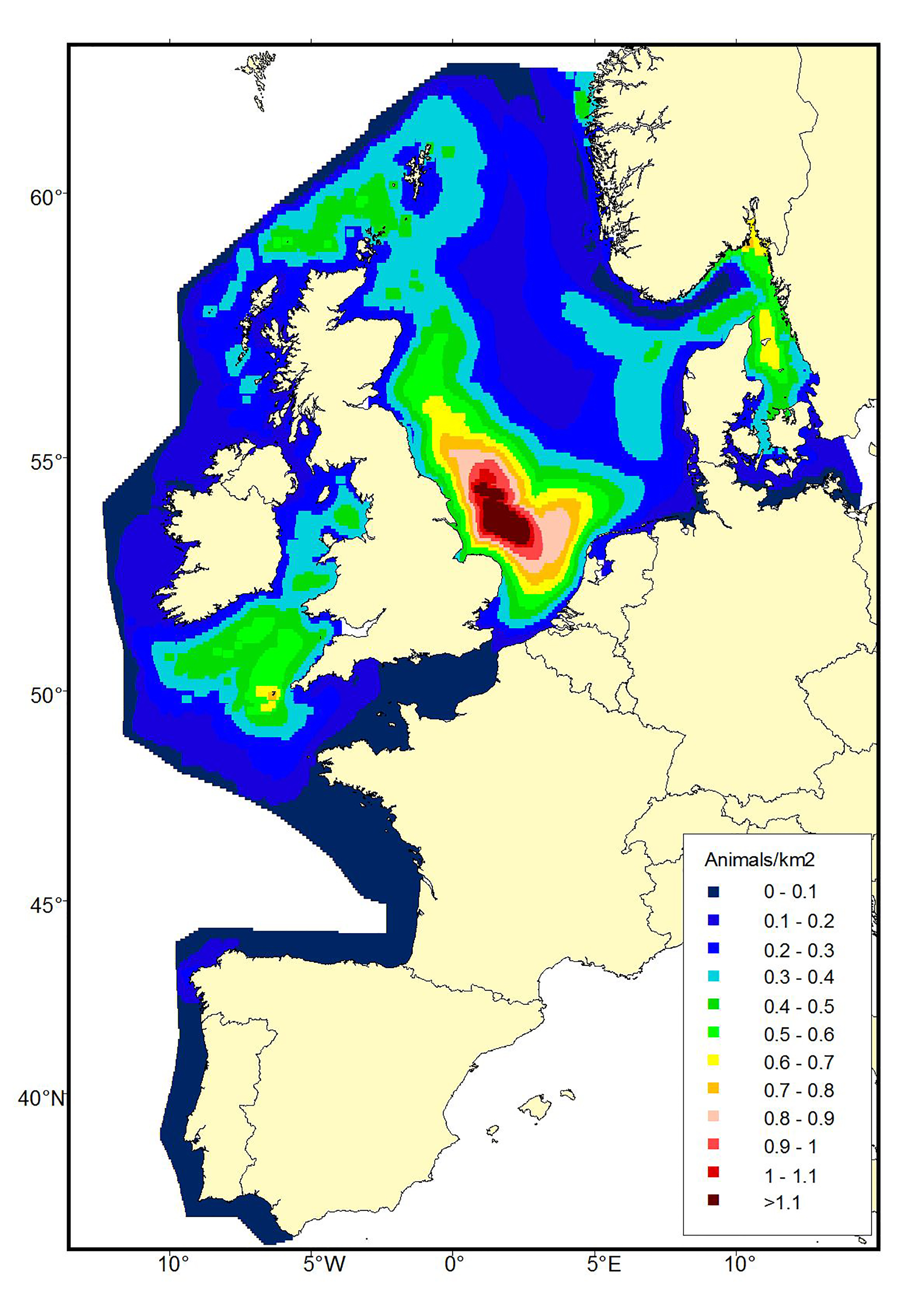 Figure 1: Maps of model-based density of various cetacean species from analyses of pooled SCANS-II, CODA and T-NASS data in summer 2005 and 2007 in the European Atlantic