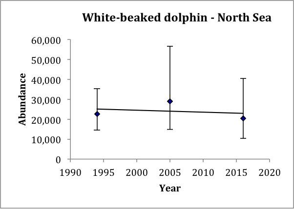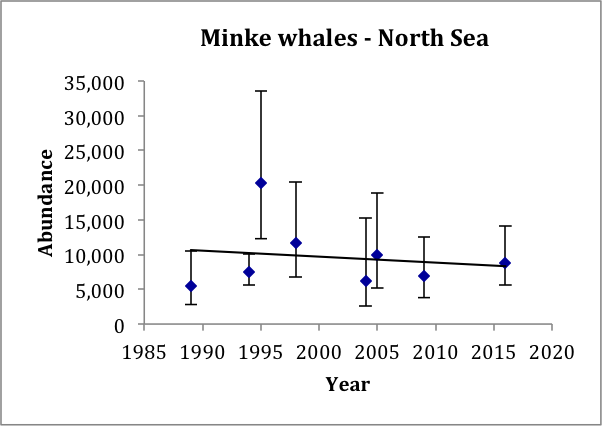 For most species, only two abundance estimates are currently available so a robust assessment of a trend involving change from a baseline is not possible. For harbour porpoise and white-beaked dolphin (Lagenorhynchus albirostris) in the Greater North Sea there are three estimates available (SCANS, SCANS-II and SCANS-III) so an assessment of sorts is possible. For minke whale, there are eight estimates available in the North Sea from SCANS and Norwegian surveys from 1989 to 2016 allowing a more robust assessment. For harbour porpoise in the Kattegat / Belt Seas, there are four estimates available.