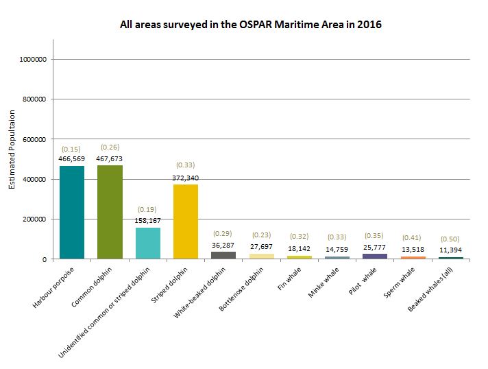 Density distribution maps of cetaceans in the Greater North Sea, Celtic Seas, and Bay of Biscay and Iberian Coast indicate that cetaceans are distributed widely across the OSPAR Maritime Area (Figure 1). The relatively small amount of overlap in predicted high-use areas highlights how species use the marine area in different ways. Harbour porpoises are mostly restricted to continental shelf waters. Striped dolphin, fin whale, sperm whale, beaked whale and pilot whales are primarily found in deep waters beyond the shelf edge. Bottlenose, white-beaked and common dolphins and minke whales are found in both shelf and deep waters. The most recent SCANS III survey in 2016 yielded population abundance estimates for harbour porpoise, common dolphin, striped dolphin, white-beaked dolphin, bottlenose dolphin, fin whale, minke whale, pilot whale, sperm whale and beaked whales (Figure 2). However, Irish and Icelandic waters were not covered by the SCANS III survey.