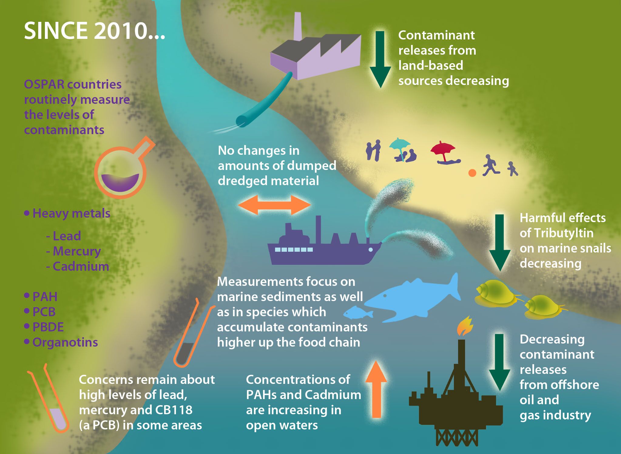 Since the QSR 2010, contaminant concentrations have continued to decrease in the majority of areas assessed, especially for PCBs. Although concentrations are generally below levels likely to harm marine species in the areas assessed, they mostly have not yet reduced to background levels (where these are specified). Concerns remain in some localised areas with respect to high levels of mercury, lead, and CB118 (one of the most toxic PCB congeners) and locally increasing concentrations of PAHs and cadmium in open waters.