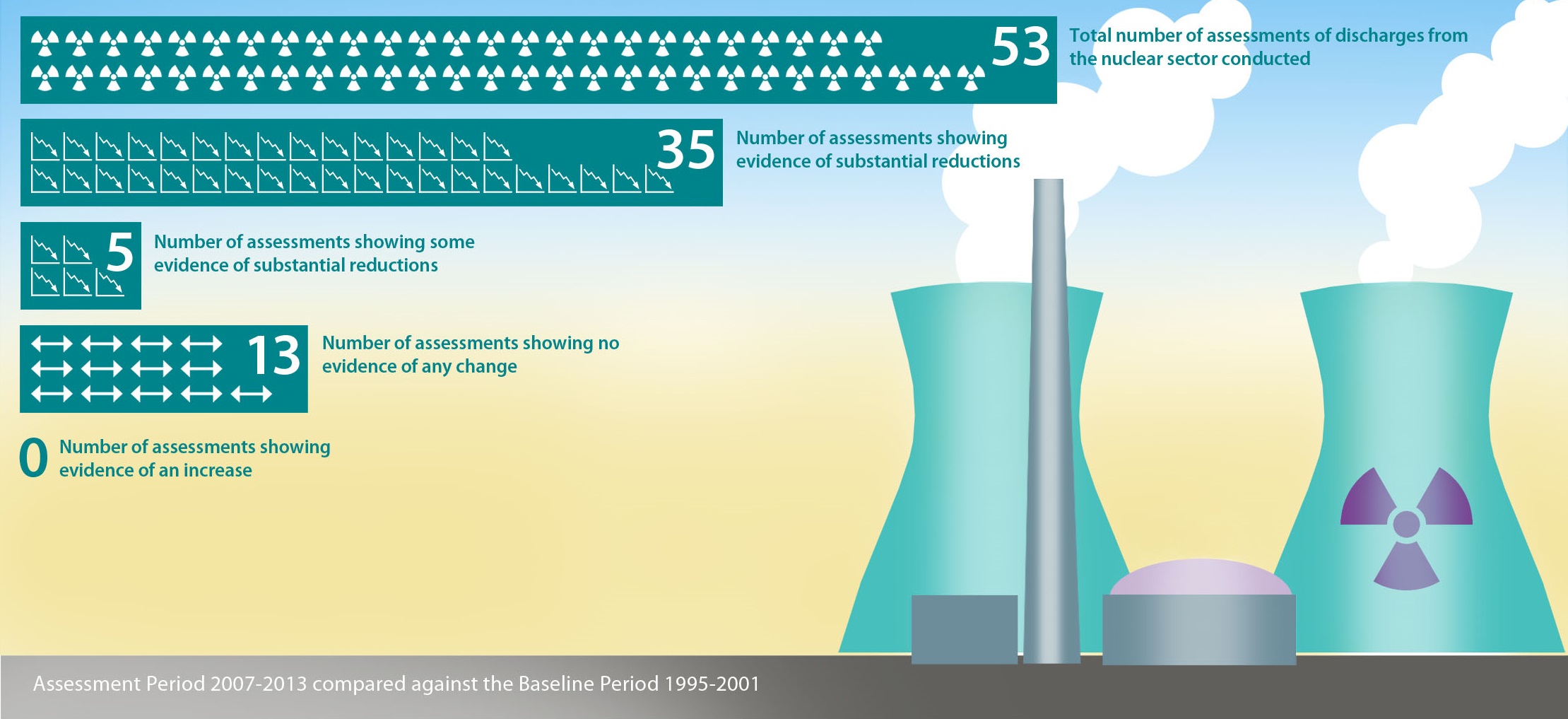The latest evaluation shows continued progress by OSPAR Countries towards the OSPAR objectives in the nuclear sector (fuel reprocessing plants, nuclear power plants, research and development facilities, and nuclear fuel production and enrichment). For 35 out of 53 (66%) of the assessments for the nuclear sector, there is evidence of substantial reductions in radioactive discharges since the baseline period (1995–2001). None of the assessments showed evidence of an increase in discharges.