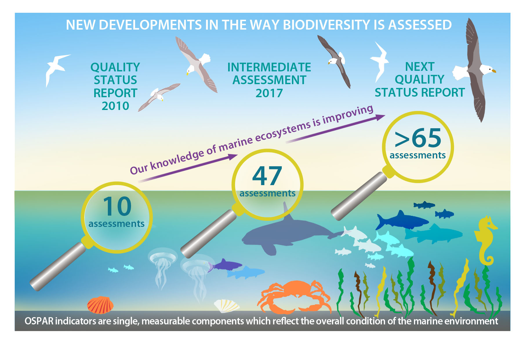 The development of internationally coordinated biodiversity indicators is a relatively new field for OSPAR. In the Quality Status Report 2010, OSPAR assessed ten ecological quality objectives developed for the North Sea which focused mainly on the interactions between mobile species and human pressures. However, they lacked agreed tools to make a fuller assessment of the health of the key structural and functional building blocks of the ecosystem: the habitats of the seafloor and the water column, their biological communities and the foodweb processes that connect them.