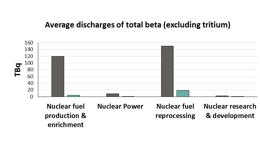 For the nuclear sector, the main contributors to the total activity discharged during the baseline period were the nuclear fuel reprocessing and nuclear fuel production and enrichment sub-sectors, however discharges from all the nuclear sub-sectors reduced. While discharges from the reprocessing sub-sector are much reduced, it remains the dominant source of discharges from the nuclear sector – contributing approximately 90% of the total alpha discharges and approximately 80% of the total beta (excluding tritium) discharges over the assessment period.