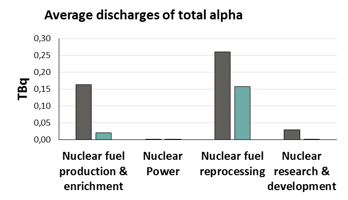 Figure 2: Change in discharge of total alpha between the baseline period (1995 – 2001) (grey columns) and the assessment (2007 – 2013) (blue columns) for the four nuclear sub-sectors.