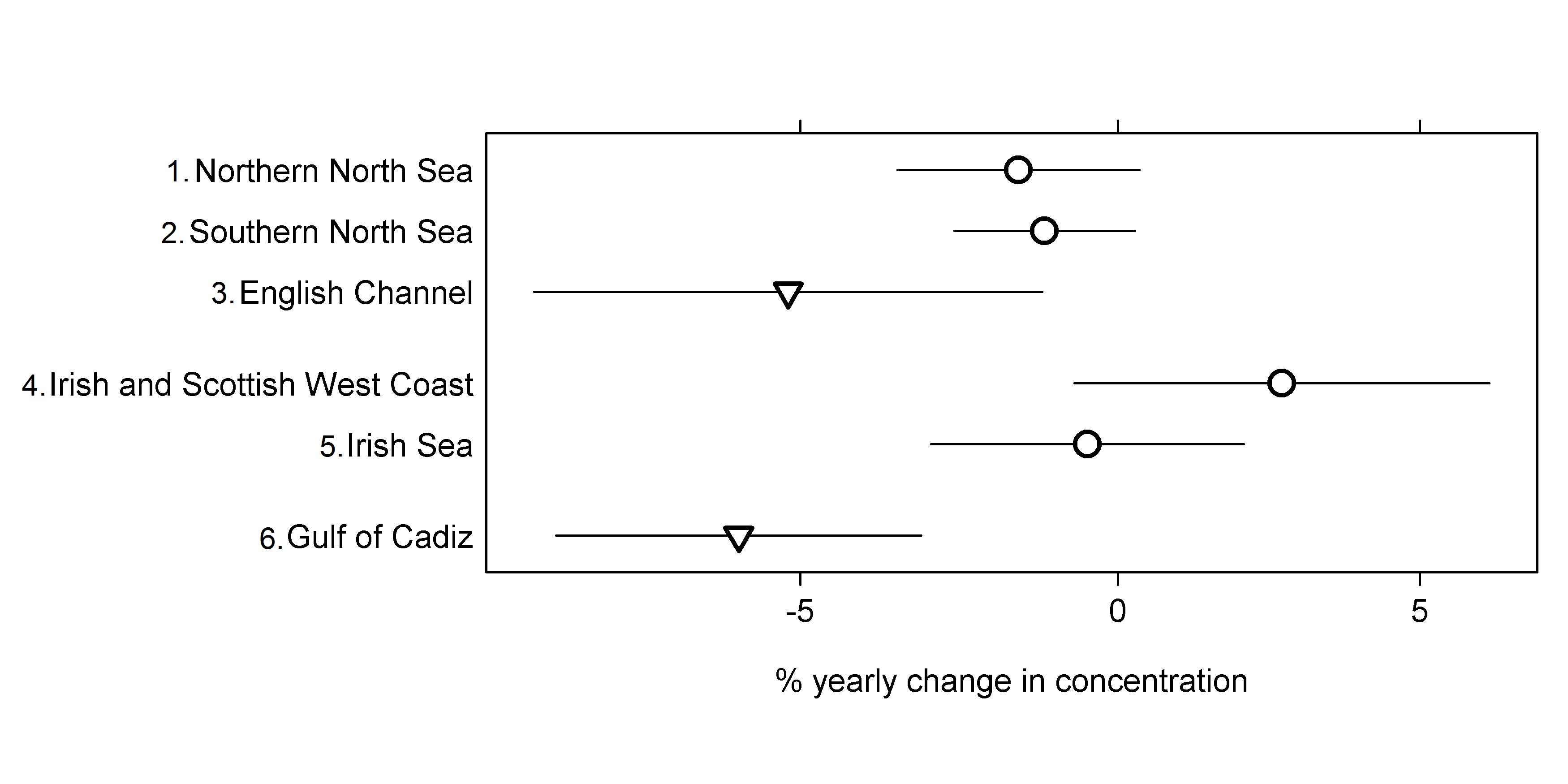 Statistically significant (p <0.05) downward temporal trends (downward triangle), no statistically significant (p <0.05) change (circle). 95% confidence limits (lines)