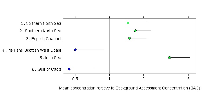 Mean PAH concentrations in sediment are statistically significantly below the ERL in all contaminants assessment areas (Figure 2). Therefore adverse biological effects in marine species are unlikely. Concentrations are lowest in the Gulf of Cadiz and in the Irish and Scottish West Coast sediments and are at background (i.e. statistically significantly below the BAC). In the other four assessment areas mean concentrations are below the ERL but not statistically significantly below the BAC.