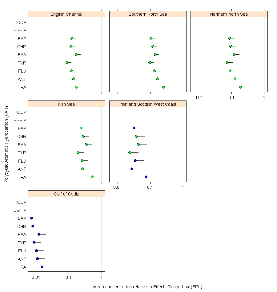 PAH concentrations were compared against two assessment criteria: the OSPAR Background Assessment Concentration (BAC) and the United States Environmental Protection Effects Range-Low (ERL). Mean PAH concentrations (normalised to organic carbon in the Greater North Sea and Celtic Seas) relative to the BAC for each assessment area are shown in Figure a. Mean PAH concentrations in sediment were lowest in the Gulf of Cadiz and in the Irish and Scottish West Coast sediments. Concentrations were statistically significantly below the BACs for all individual PAHs in the Gulf of Cadiz and for six of the nine PAH compounds in the Irish and Scottish West Coast. Concentrations were also statistically significantly below BACs for two individual PAHs in the English Channel and Southern North Sea. The Irish Sea and Northern North Sea concentrations are not statistically significantly below the BACs for any PAHs.