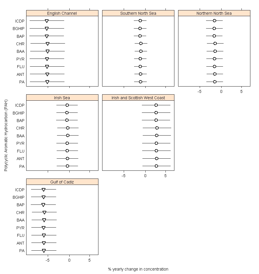 Temporal trends in PAH concentrations were assessed in areas where there were at least five years of data. The percentage yearly change for each PAH in each assessment area is shown in Figure c.