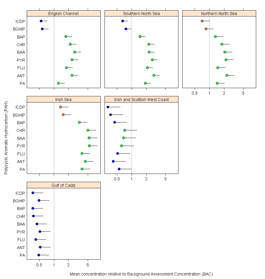 Figure a: Mean PAH concentration in sediment in each OSPAR contaminants assessment area, relative to the background assessment concentration (BAC) (with 95% upper confidence limits)