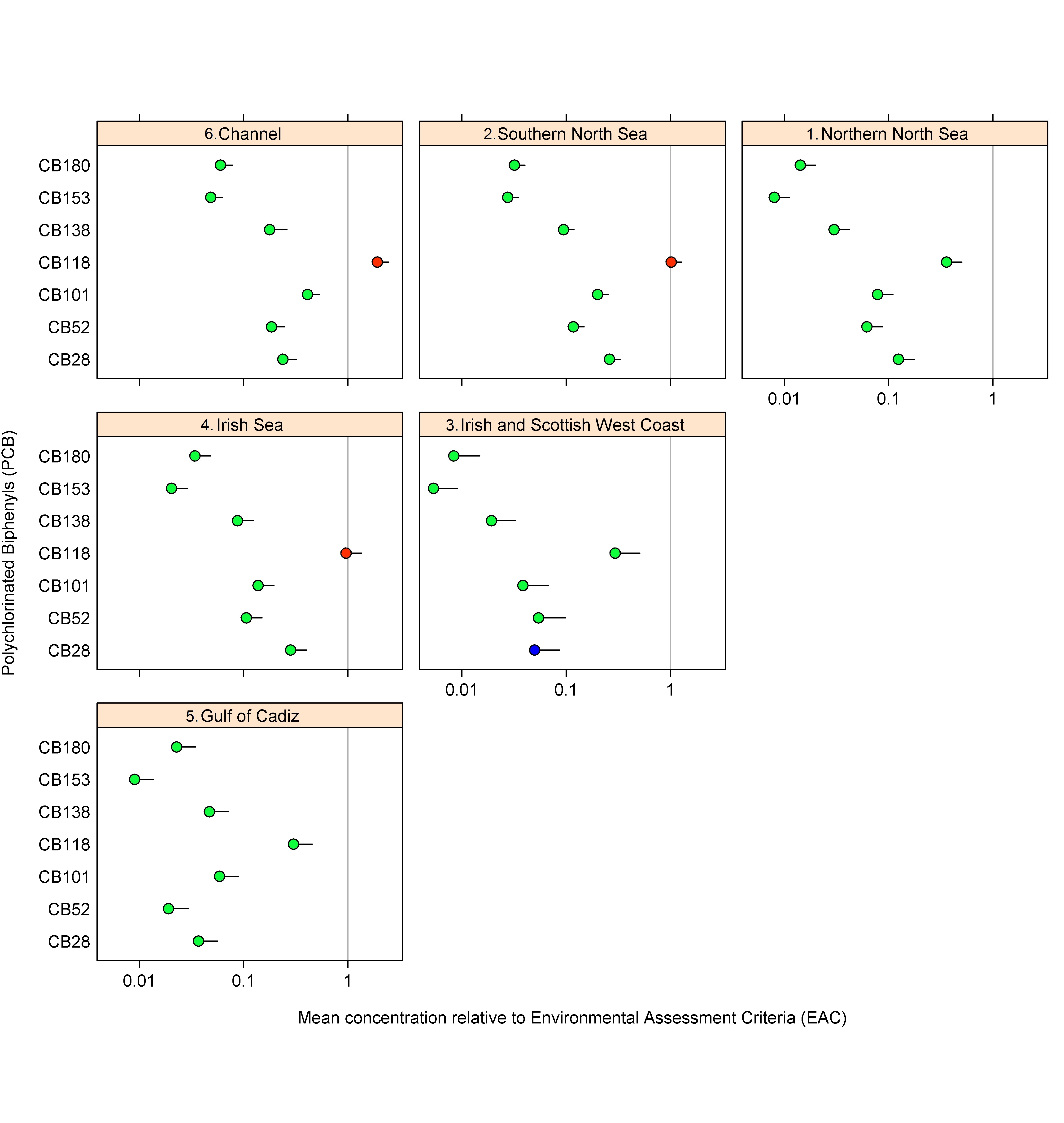 Value of 1 means that the mean concentration equals the EAC. Blue, mean concentration statistically significantly (p <0.05) below the congener’s Background Assessment Concentration (BAC). Green, mean concentration statistically significantly above the congener’s BAC but below the Environmental Assessment Criteria (EAC). Red, mean concentration not statistically significantly below the EAC