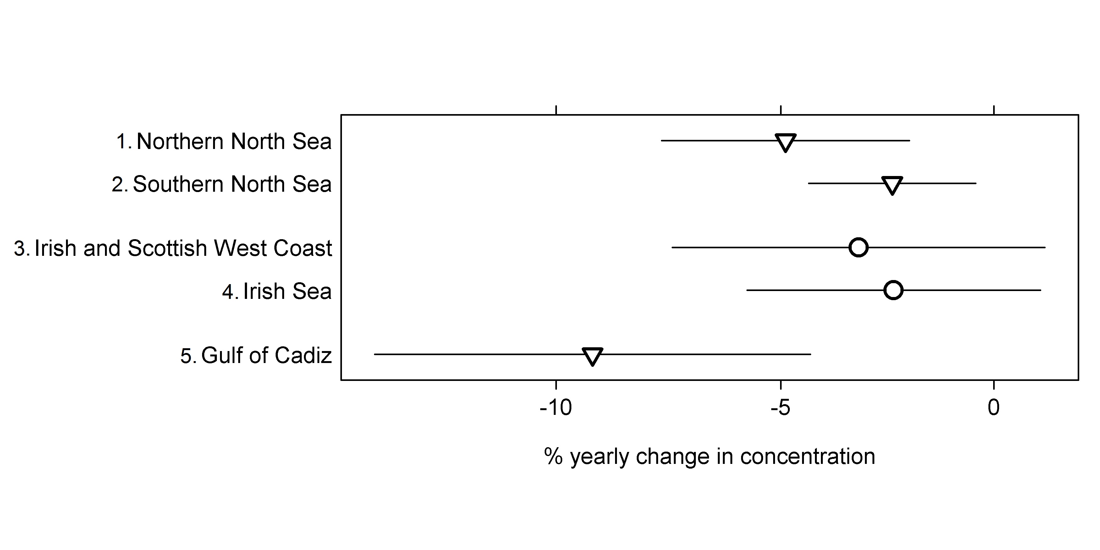 PCB concentrations are decreasing in the Northern North Sea, Southern North Sea and Gulf of Cadiz. In contrast, concentrations show no statistically significant change in the Irish and Scottish West Coast and the Irish Sea (Figure 2).