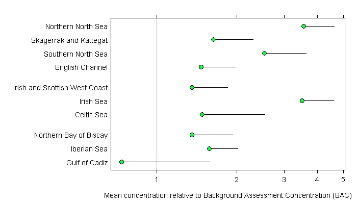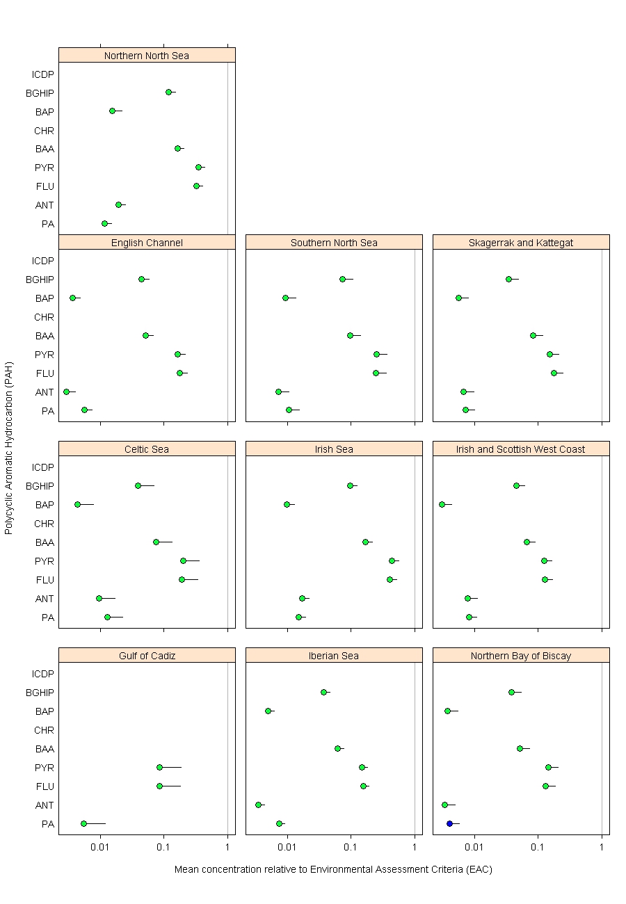 PAH concentrations were compared against two assessment criteria: the OSPAR Background Assessment Concentrations (BACs) and Environmental Assessment Criteria (EACs). Adverse effects on marine organisms are rarely observed when concentrations are below the EAC. BACs are used to assess whether concentrations are near background values for naturally occurring substances, such as PAHs; this is the ultimate aim of the OSPAR Hazardous Substances Strategy.