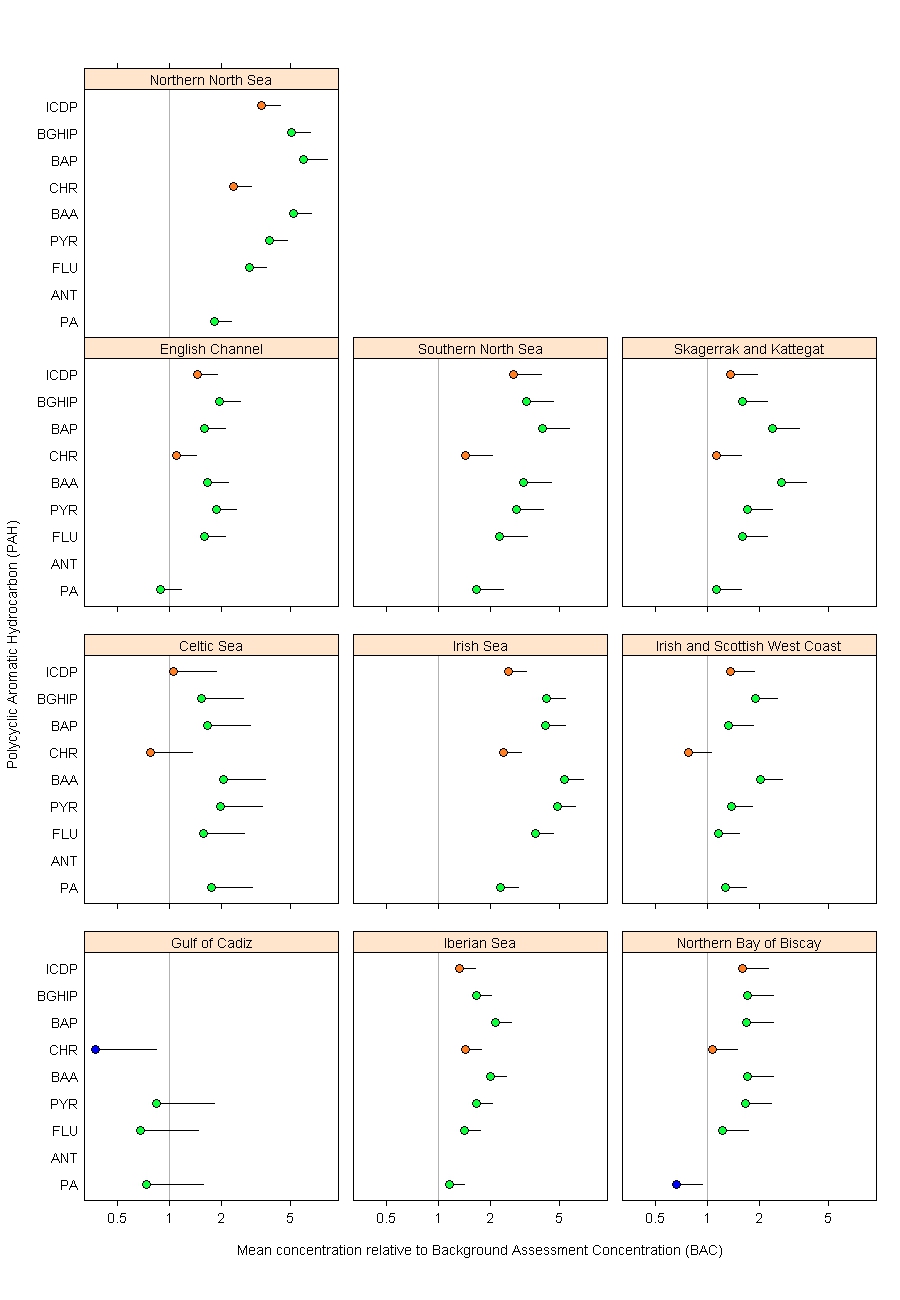 Figure a: Mean PAH concentration in shellfish in each OSPAR contaminants assessment area, relative to the Background Assessment Concentration (BAC) (with 95% upper confidence limits)
