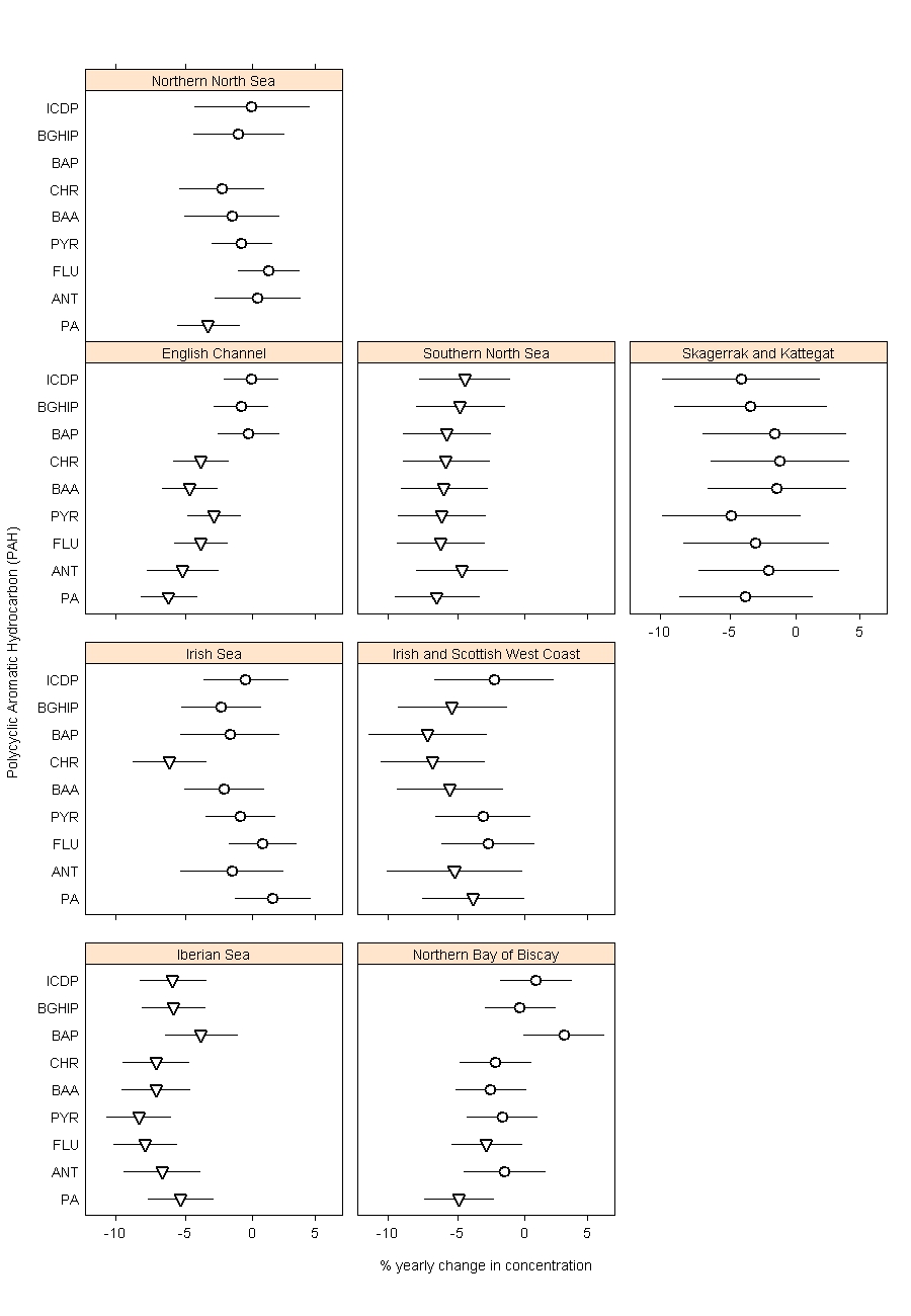 For each PAH compound at each monitoring site, the time series of concentration measurements was assessed for temporal trends and status using the methods described in the contaminants online assessment tool (http://dome.ices.dk/osparmime2016/main.html). The results from these individual time series were then synthesised at the assessment area scale in a series of meta-analyses.