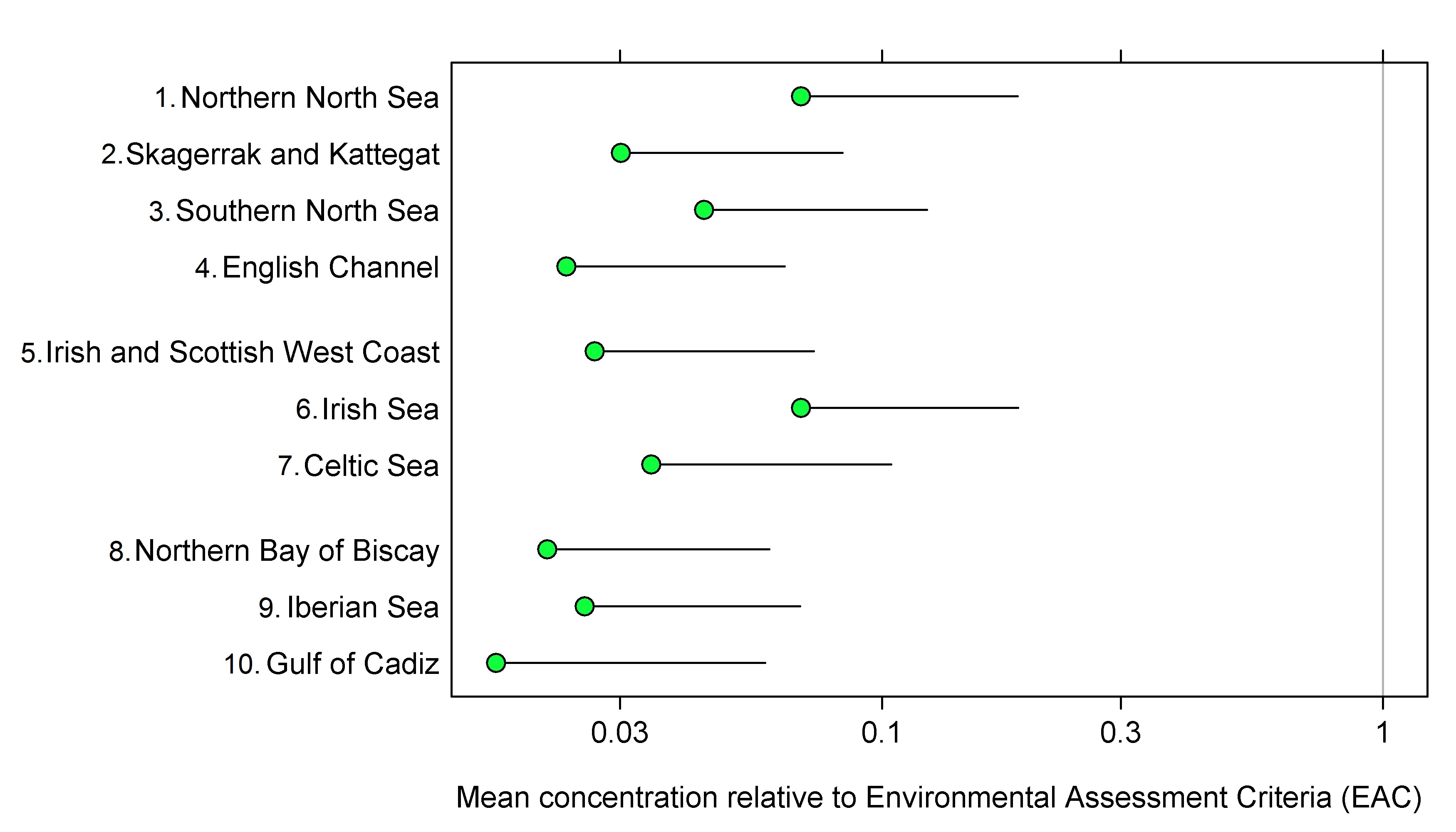 Environmental Assessment Criteria (EACs) were developed by OSPAR and ICES for assessing the ecological significance of biota concentrations. Some EAC values were specifically compiled for the assessment of CEMP monitoring data on hazardous substances contributing to the QSR 2010 (OSPAR Agreement 2009-2). EACs do not represent target values or legal standards under the OSPAR Convention and should not be used as such. EACs were set so that hazardous substance concentrations in biota below the EAC should not cause chronic effects in sensitive marine species, including the most sensitive species, nor should concentrations present an unacceptable risk to the environment and its living resources. However, the risk of secondary poisoning is not always considered. EACs continue to be developed for use in data assessments.
