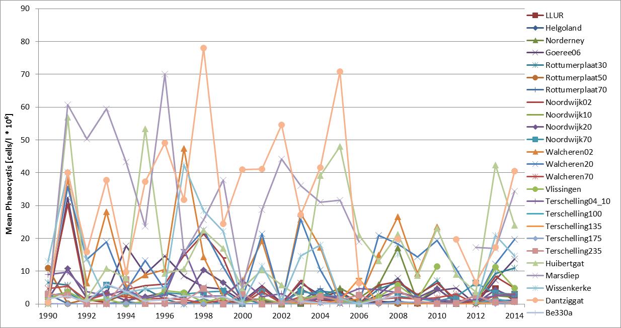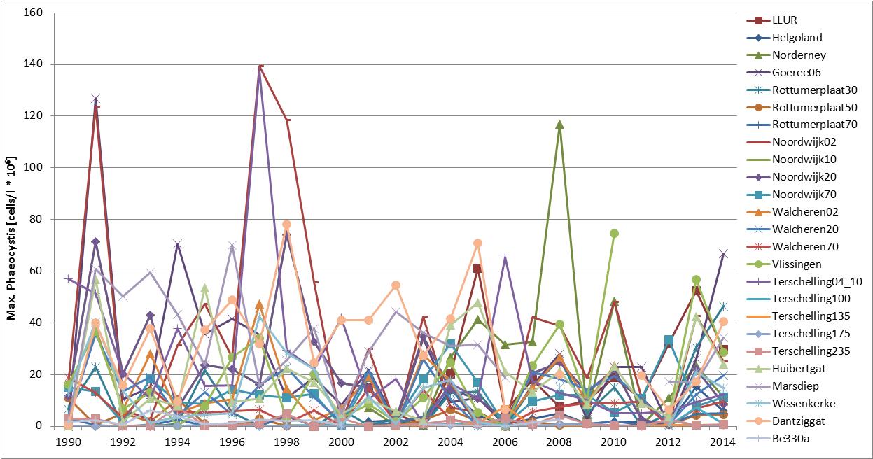 Figure d: Maximum abundance (April–August) of Phaeocystis at Belgian (Be 330a; 1990–2009), Dutch (1990–2014) and German (Helgoland Reede, LLUR, Norderney, 2001–2014) monitoring sites. For monitoring site locations see Figure 1
