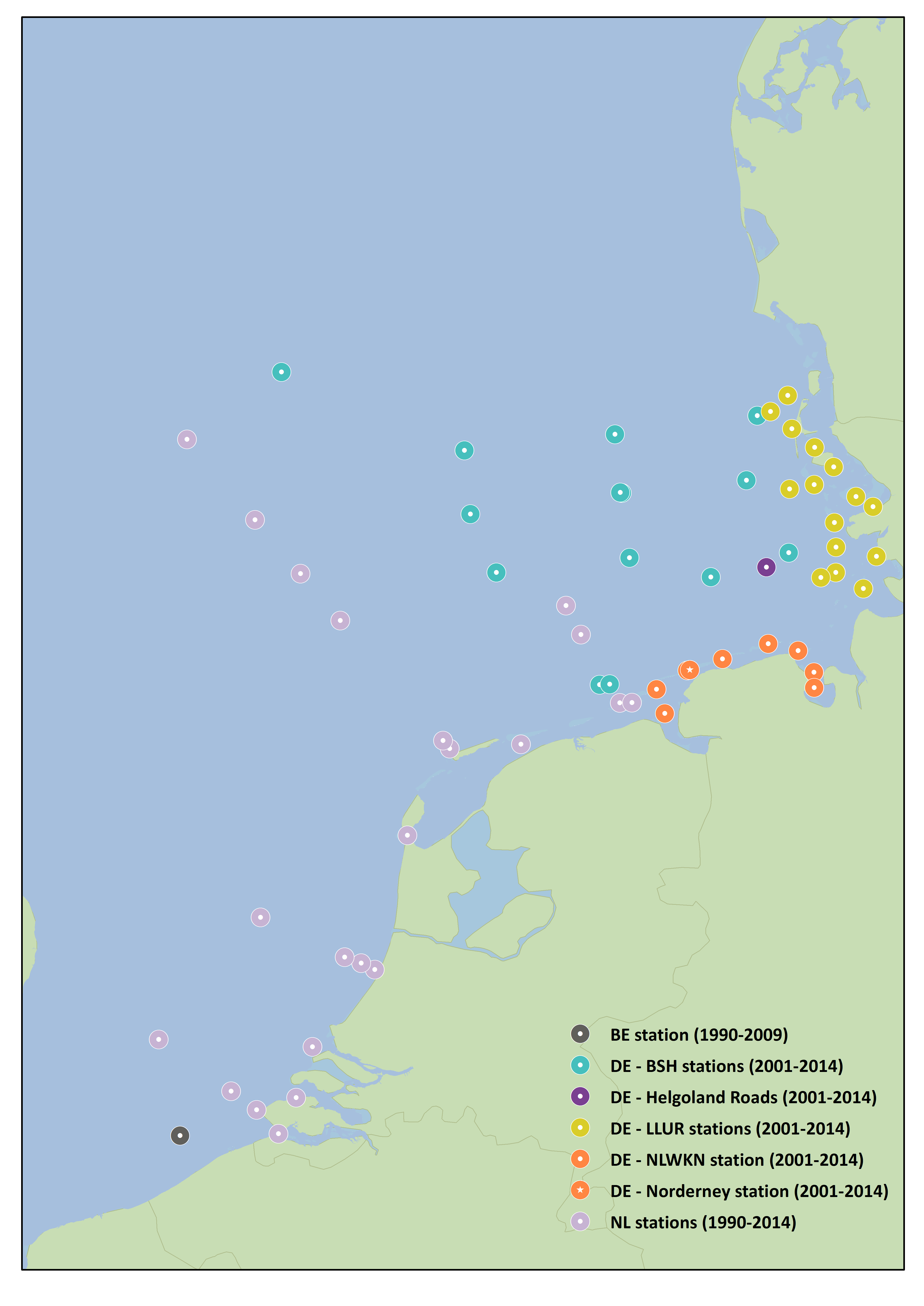 Figure 1: Sites monitored for Phaeocystis by Belgium (BE), the Netherlands (NL) and Germany (DE) (2003–2012)