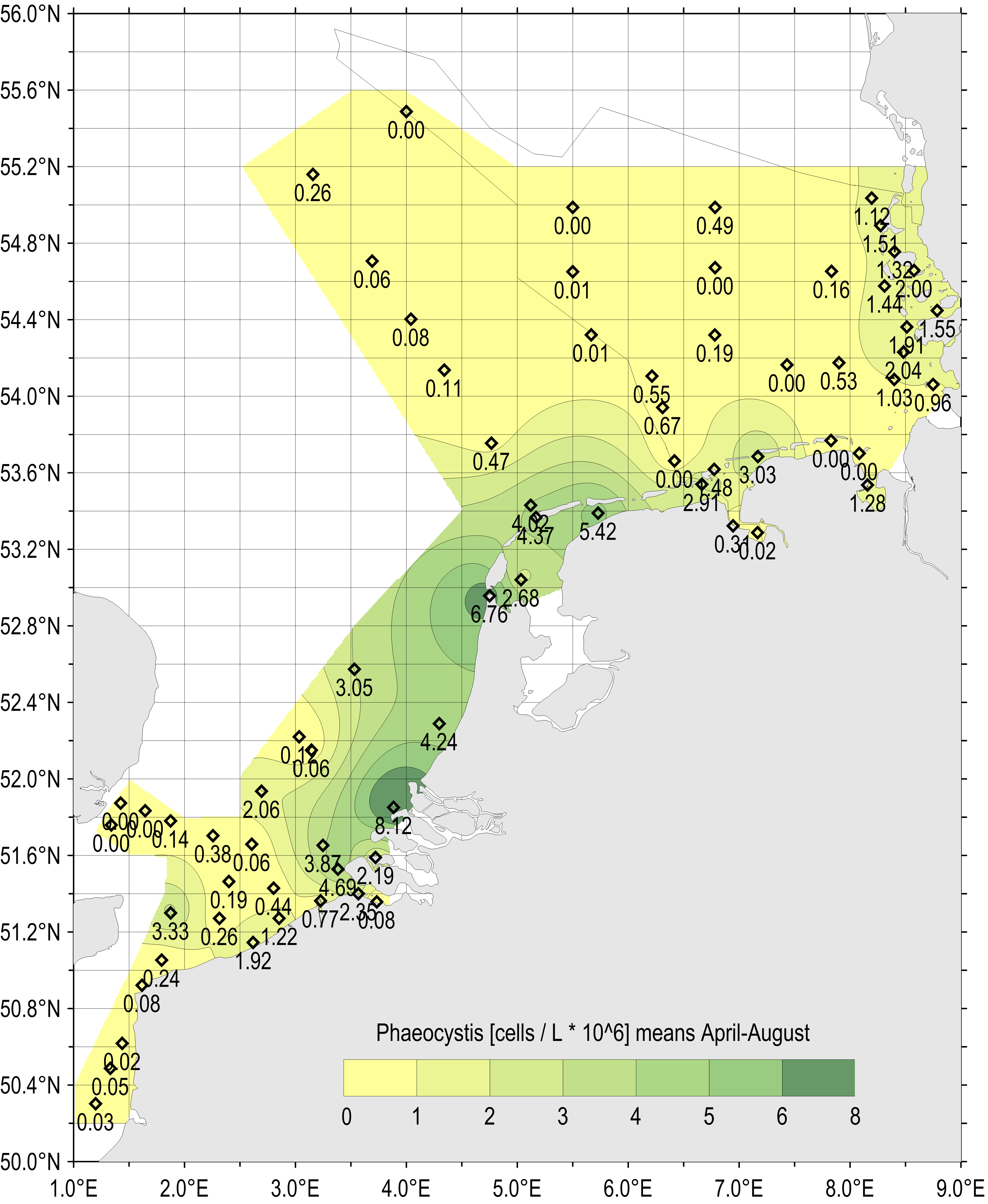 Figure e: Gradients of average Phaeocystis concentration for the period April–August (all available years and monitoring sites 1990–2014)