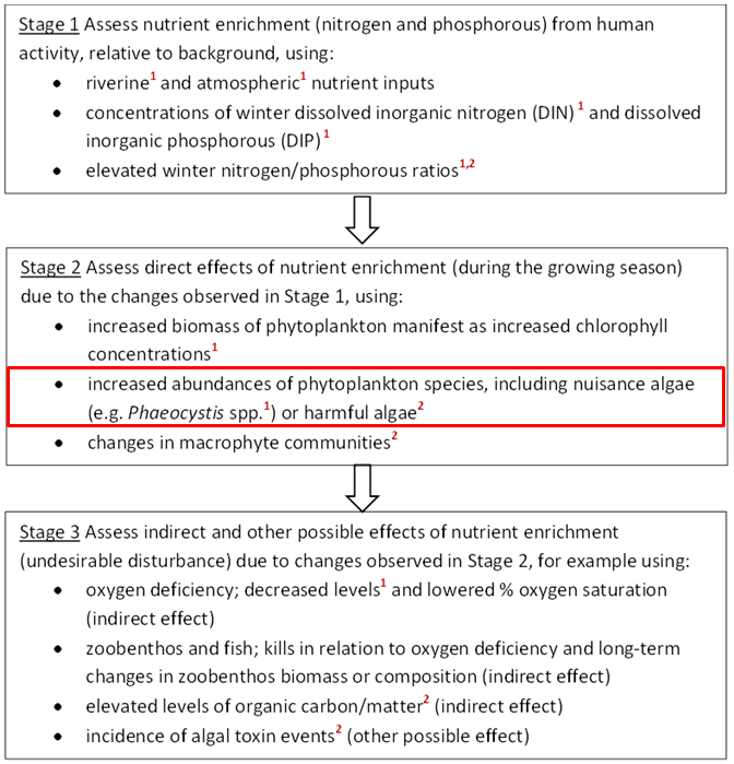 Figure a: Three stages in the identification of eutrophication. The criteria marked ¹ are common indicators for the OSPAR Intermediate Assessment 2017.