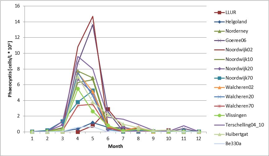 At all Dutch (1990–2010) and Belgian (1988–2009) monitoring sites and at most German (2003–2012) monitoring sites, concentrations of Phaeocystis cells peak each year during the growing season, April–May. At the northern part of the German coast (LLUR, Figure 1) the peak is later, usually during June.