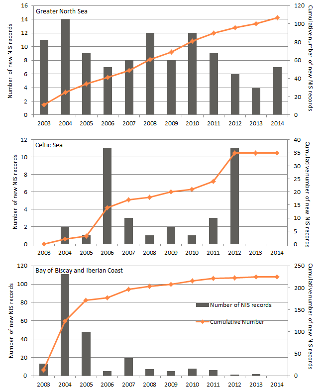 The number of new non-indigenous species (NIS) recorded for the Greater North Sea, Celtic Seas and the Bay of Biscay and Iberian Coast over the period 2003–2014, varied by year and region (Figure 1), but showed no overall trend in the number of new NIS records over the assessment period.