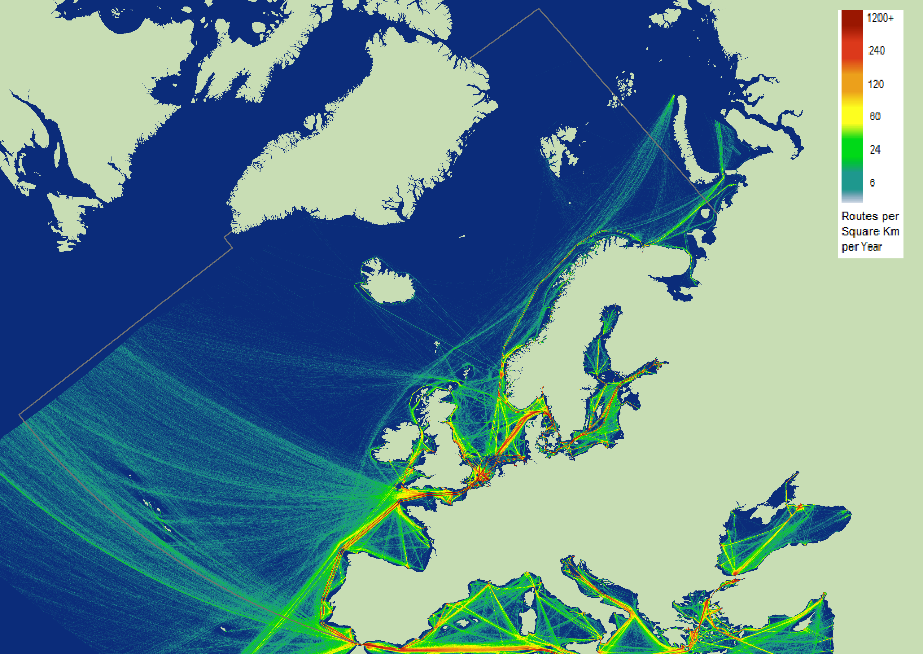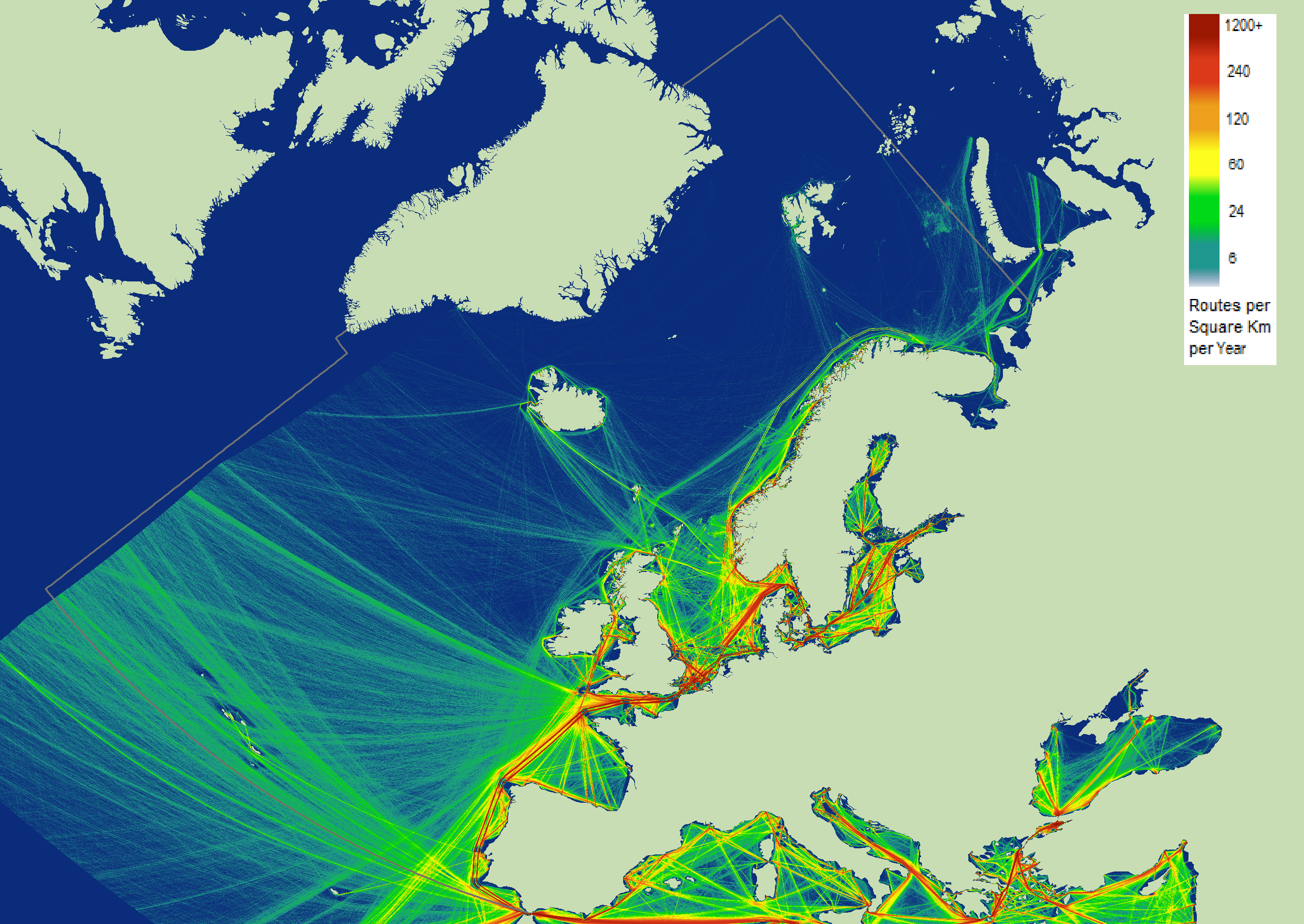 Figure 1: Route density map of cargo shipping in the OSPAR area 2019 (Source EMODnet 2020)