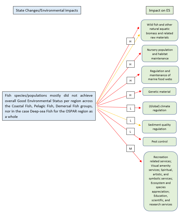 Figure I.1: Schematic depicting the 'State (changes)’ - ‘Impacts on ES’ linkages for the Fish Thematic Assessment. The ecosystem services shown are those considered most relevant to the Fish Thematic Assessment. Each arrow also denotes an expert estimate of the nature and magnitude of the impact (yellow arrow = neutral impact, red arrow = negative impact; H = high impact, M = medium impact, L = low impact)