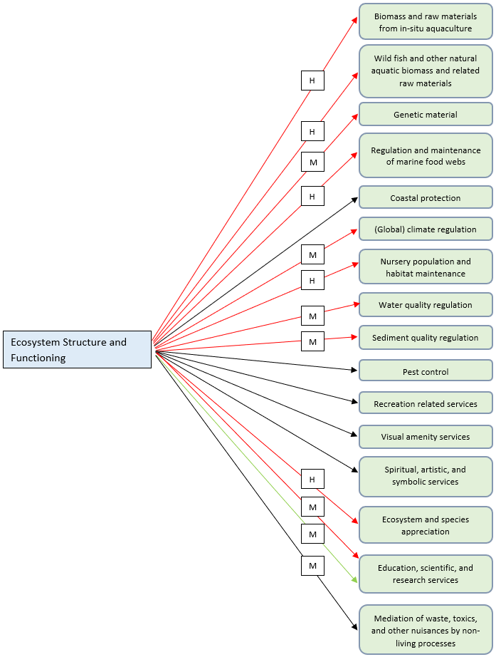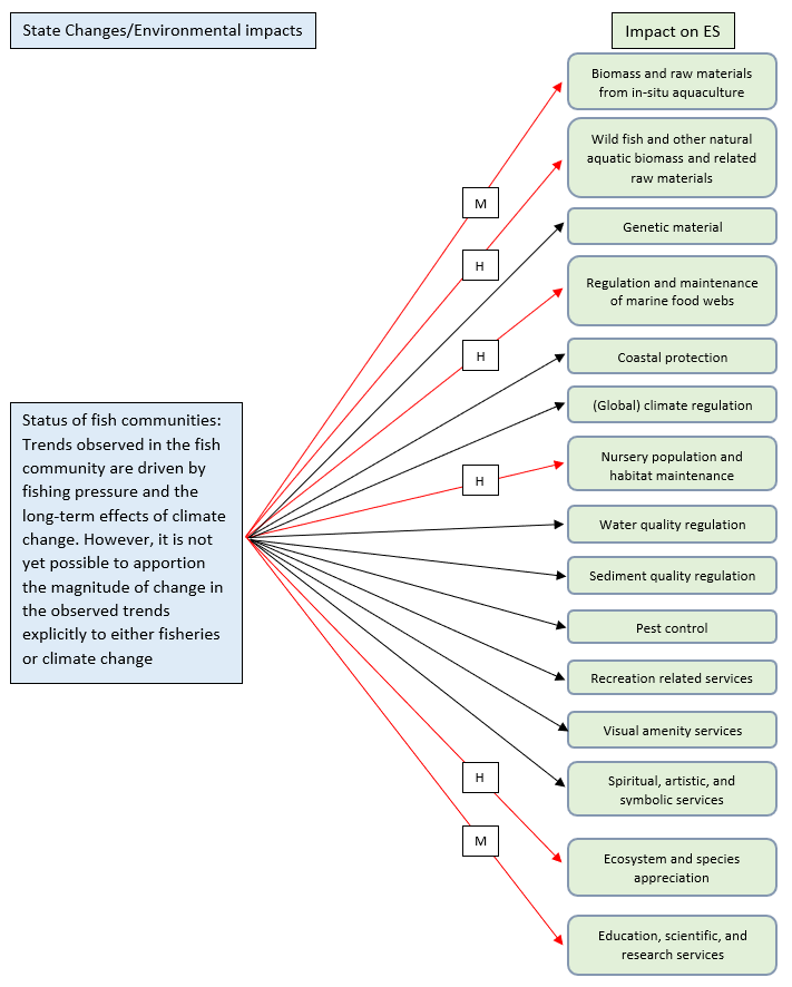 As confirmation, in relation to this specific thematic assessment, visual links to several ecosystem services (e.g. cultural ecosystem services) have been provided, even if all the ecosystem services have not been individually addressed in the narrative. This is due to the overall importance of balanced food web functioning in ensuring the good status of marine ecosystems and thus their provision of ecosystem services. All the ecosystem service mechanisms mentioned in Marine Birds Thematic Assessment , Marine Mammals Thematic Assessment , Fish Thematic Assessment , Benthic Habitats Thematic Assessment , Pelagic Habitats Thematic Assessment flow into this thematic assessment and vice versa, because all marine ecosystem components contribute to food webs.