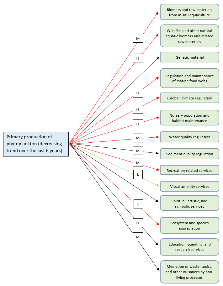 Shelf areas support most oceanic primary production and they are at the same time the areas affected by most human activities and related pressures (e.g. oil and gas, wind energy, wave and tidal renewable energy, aquaculture, aggregate dredging and waste dumping; Tweddle et al., 2018). However, the Candidate Indicator Pilot Assessment of Primary Productivity (FW2) showed several site-specific changes that do not permit a generalised conclusion for the whole OSPAR Maritime Area. This means that areas where a downward trend in annual phytoplankton production was observed, the provision of associated ecosystem services (described above) is likely to decrease. The opposite can be said for areas where high phytoplankton production can lead to an increase in the local provision of ecosystem services such as support for biomass production from shellfish farming activities (OSPAR, 2017h). In the current assessment cycle, primary production is decreasing in many assessment units. Given the general trend for the OSPAR Maritime Area, the impact of the current state of phytoplankton primary production in the OSPAR area on the related ecosystem services is mainly represented with red arrows (Figure I.1), indicating a negative impact on most of those services. Nevertheless, some of the relationships between the impact on ecosystem services and primary production remained unclear, represented by black arrows (Figure I.1). Declining primary production is likely to increase water clarity which, in turn, may have a positive effect on visual ecosystem services. This relationship is represented by the green arrow (Figure I.1).